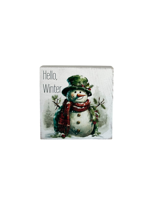 Hello Winter - Rustic Wood Block Sign Winter Snowman Decor