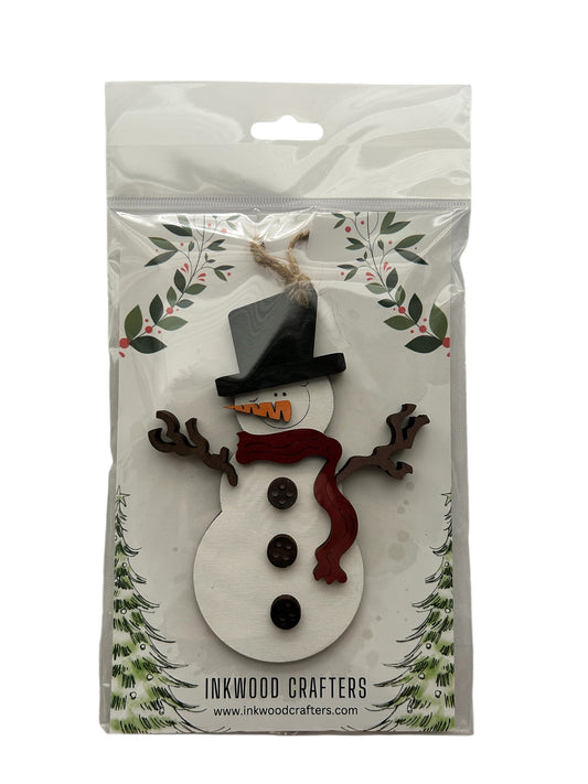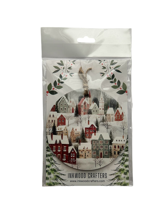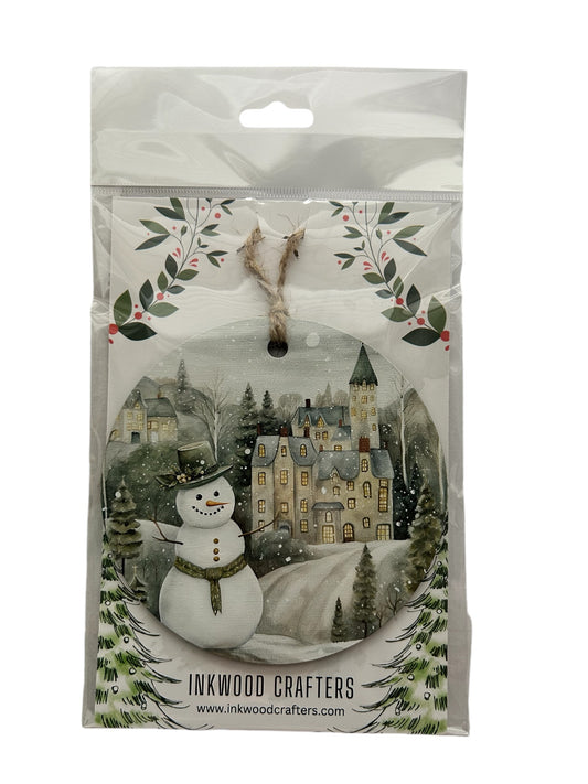 Snowman in Village - Old Fashioned Style Wood Ornament
