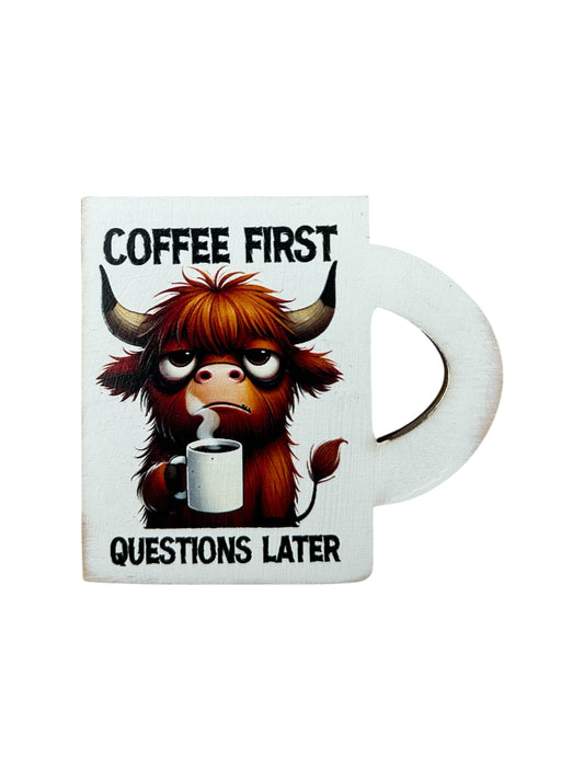 Coffee First Questions Later- Funny Coffee Decor Wood Magnet