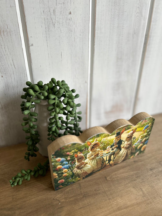 Bunny Tea Party - Rustic Spring Decor Scalloped Wood Sign