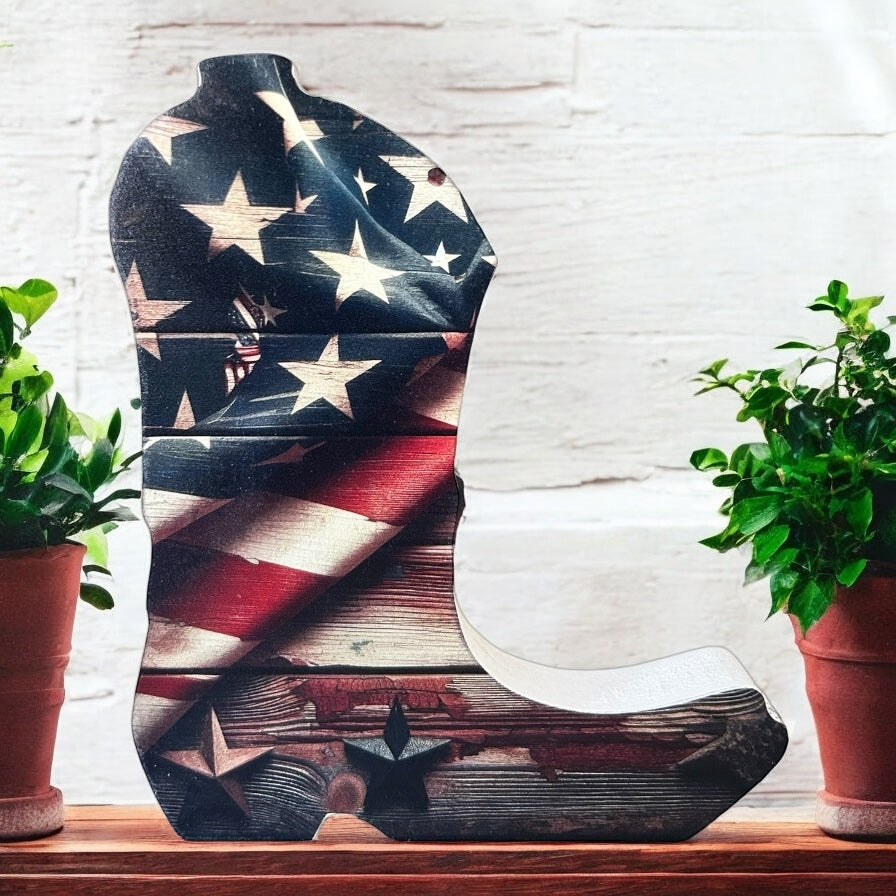 American Flag Wood Cowboy Boot - Patriotic Country Decor