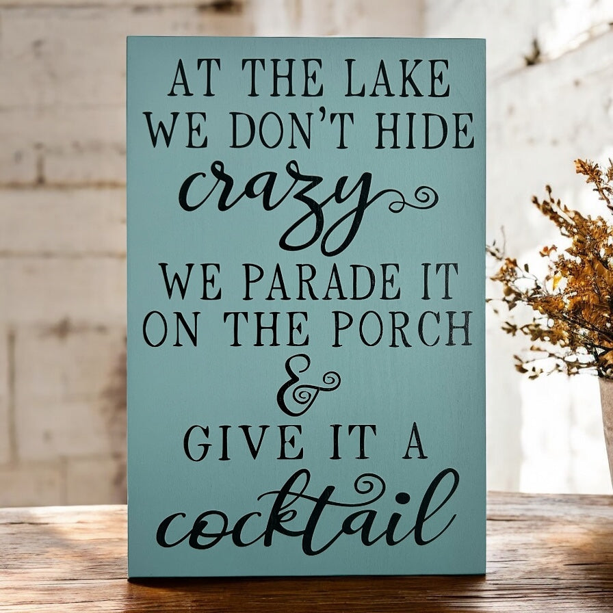 Add a touch of humor to your lakeside retreat with our "At The Lake We Don't Hide Crazy" Funny Wood Sign! Measuring 8 inches by 12 inches, this witty sign is crafted from high-quality ply and features a playful message that perfectly captures the laid-back atmosphere of lake life. Whether hung on the wall or displayed on a shelf, this sign is sure to bring smiles and laughter to all who see it.