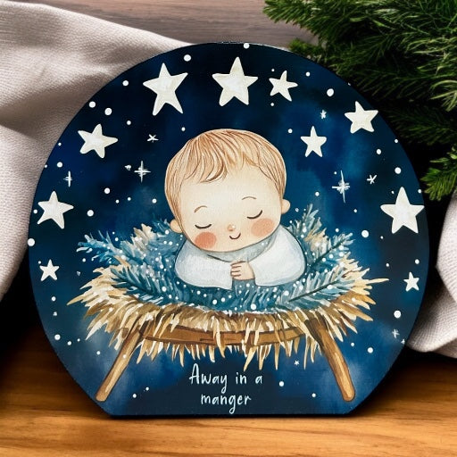 Away in a Manger - Wood Holiday Decor Circle Sign