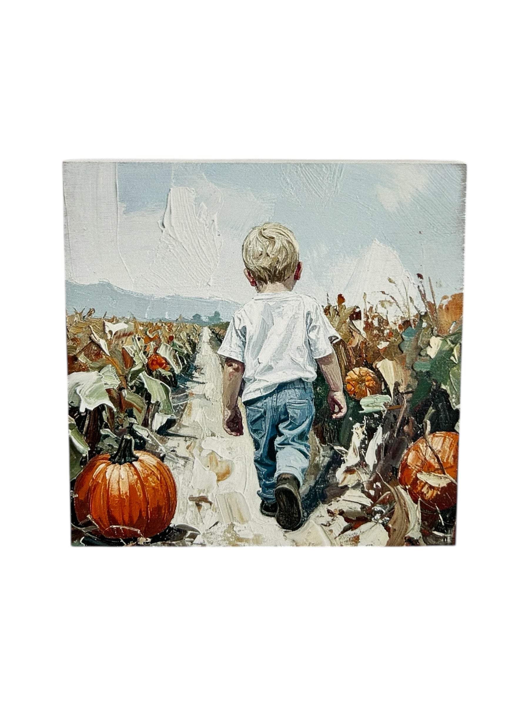 Boy in Pumpkin Patch - Autumn/Fall Decor Rustic Wood Sign