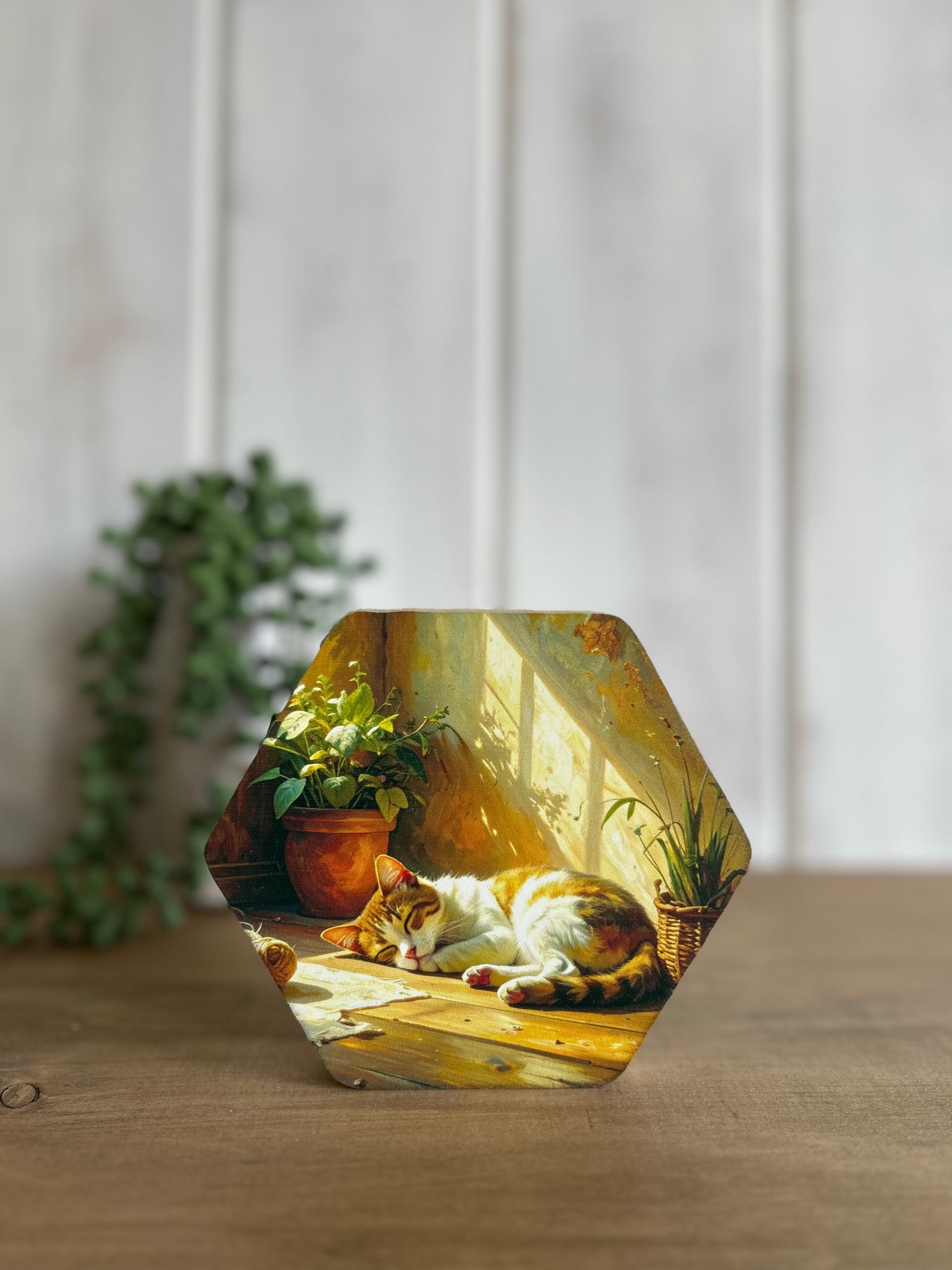 Cat Napping - Rustic Spring Decor Hexagon Wood Sign