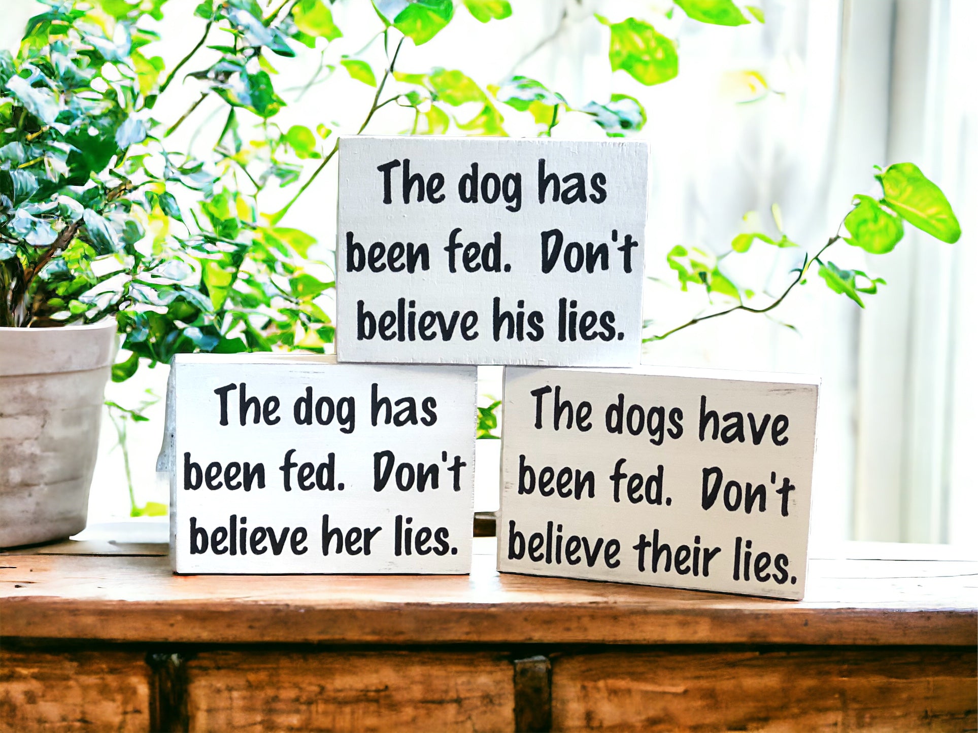Dog has been fed - Funny Rustic Wood Dog Shelf Sitter Signs