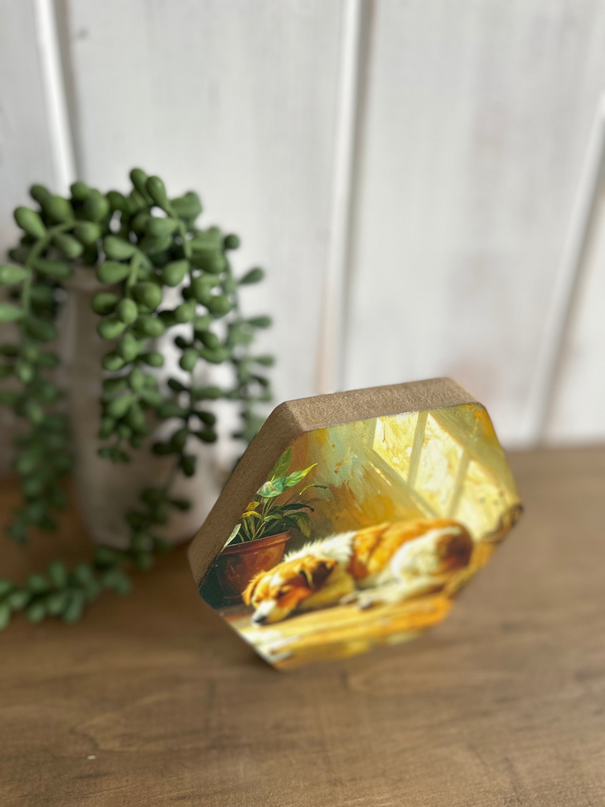 Dog Napping - Rustic Spring Decor Hexagon Wood Sign
