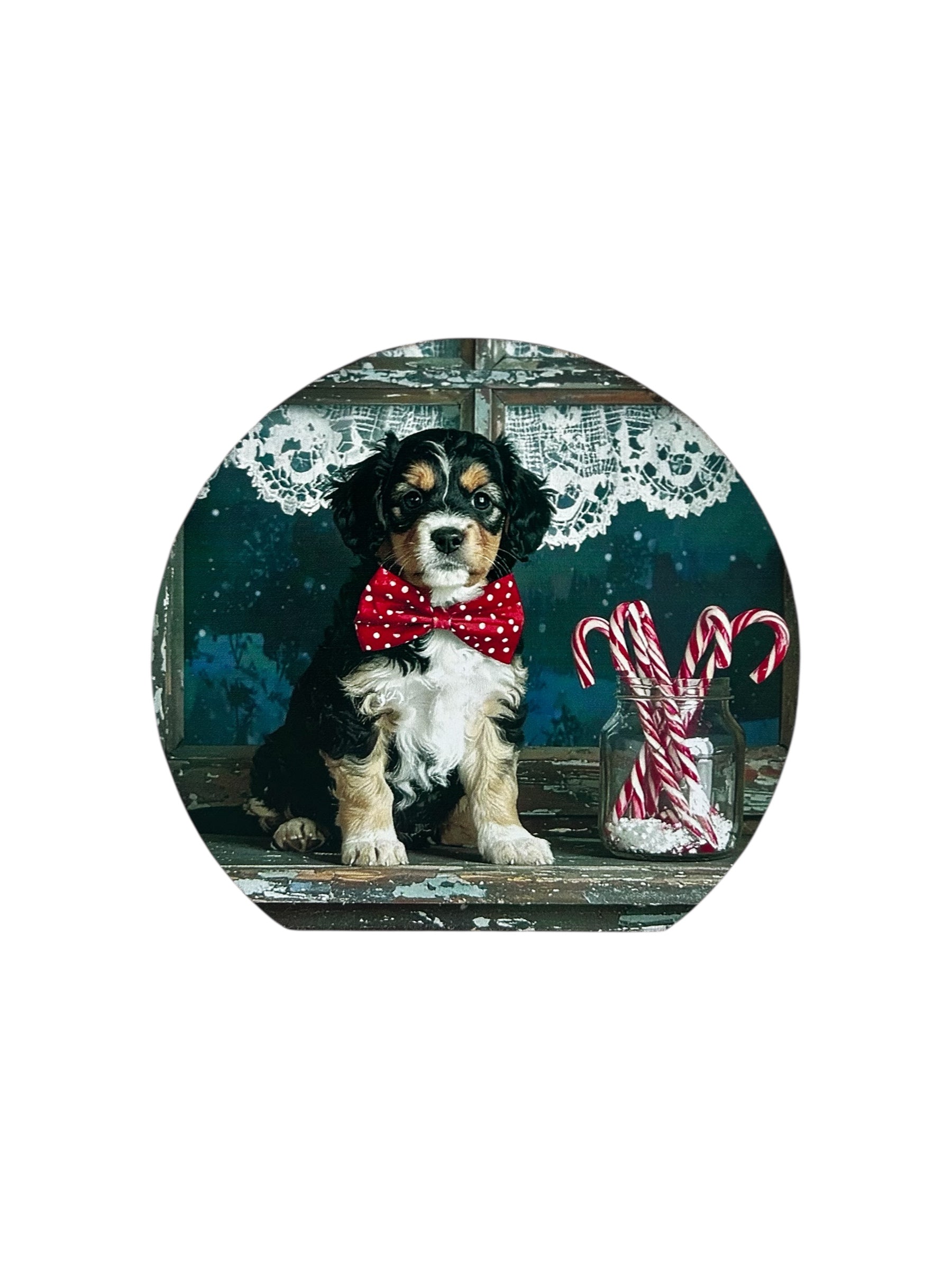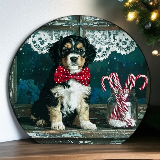 Doggy in the Window - Wood Holiday Decor Circle Sign
