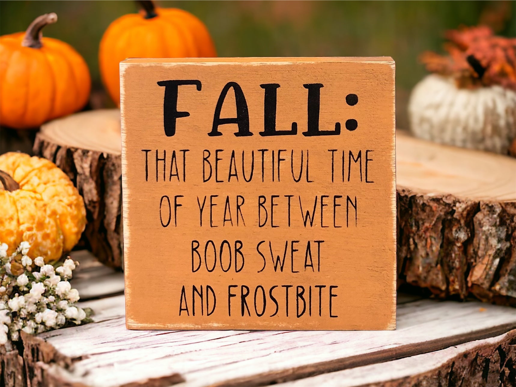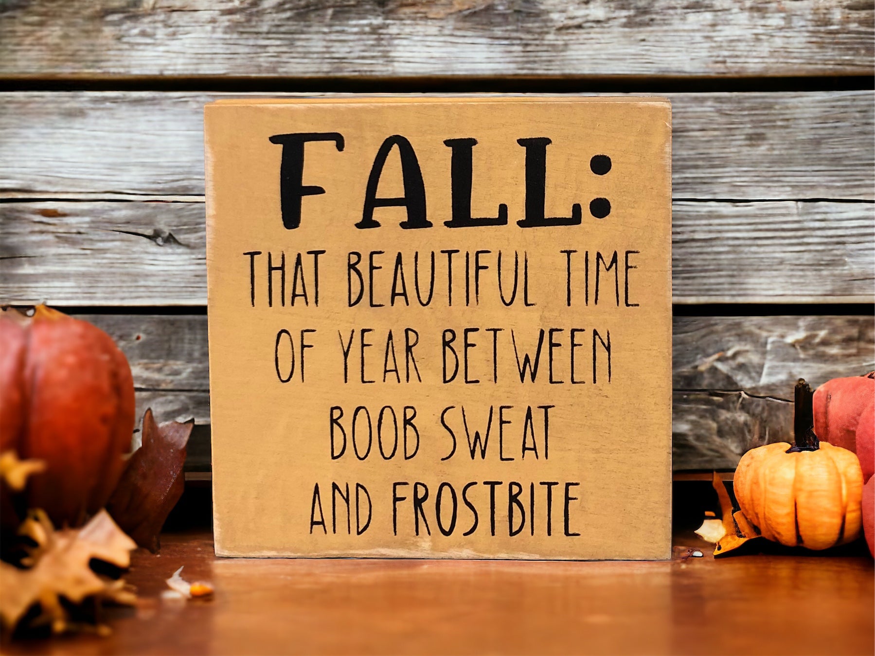 Celebrate the changing season with this funny wood shelf sitter! All of our signs are handmade in the USA on 3/4" hardwood ply with a finished back. Due to the artistry of painting and distressing, no two signs will be exactly the same.