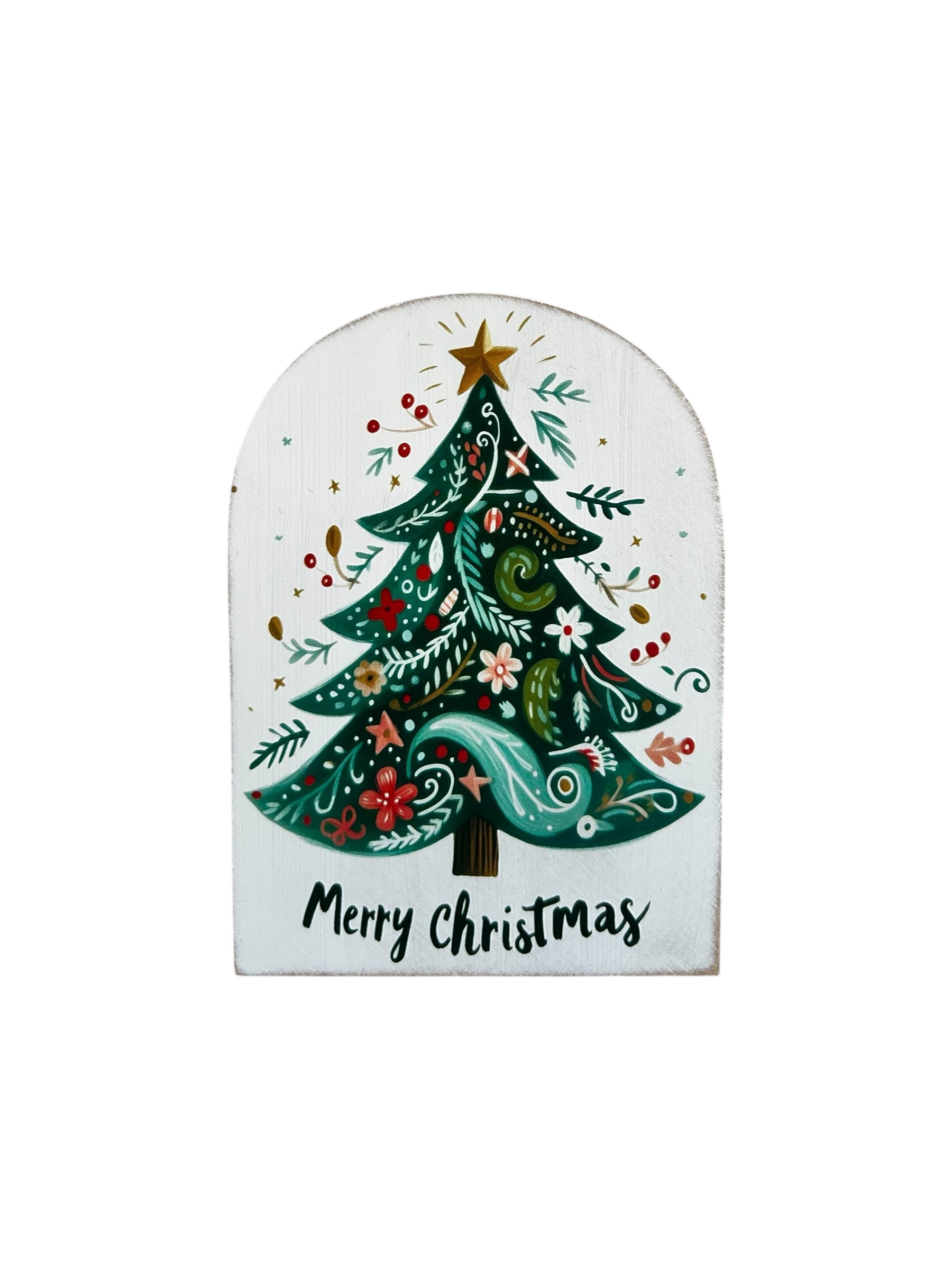 Merry Christmas boho folk art design printed on a 3/4”MDF free standing wood arch. Painted white on front and sides, sanded and a high quality image printed on the front with UV cured ink.