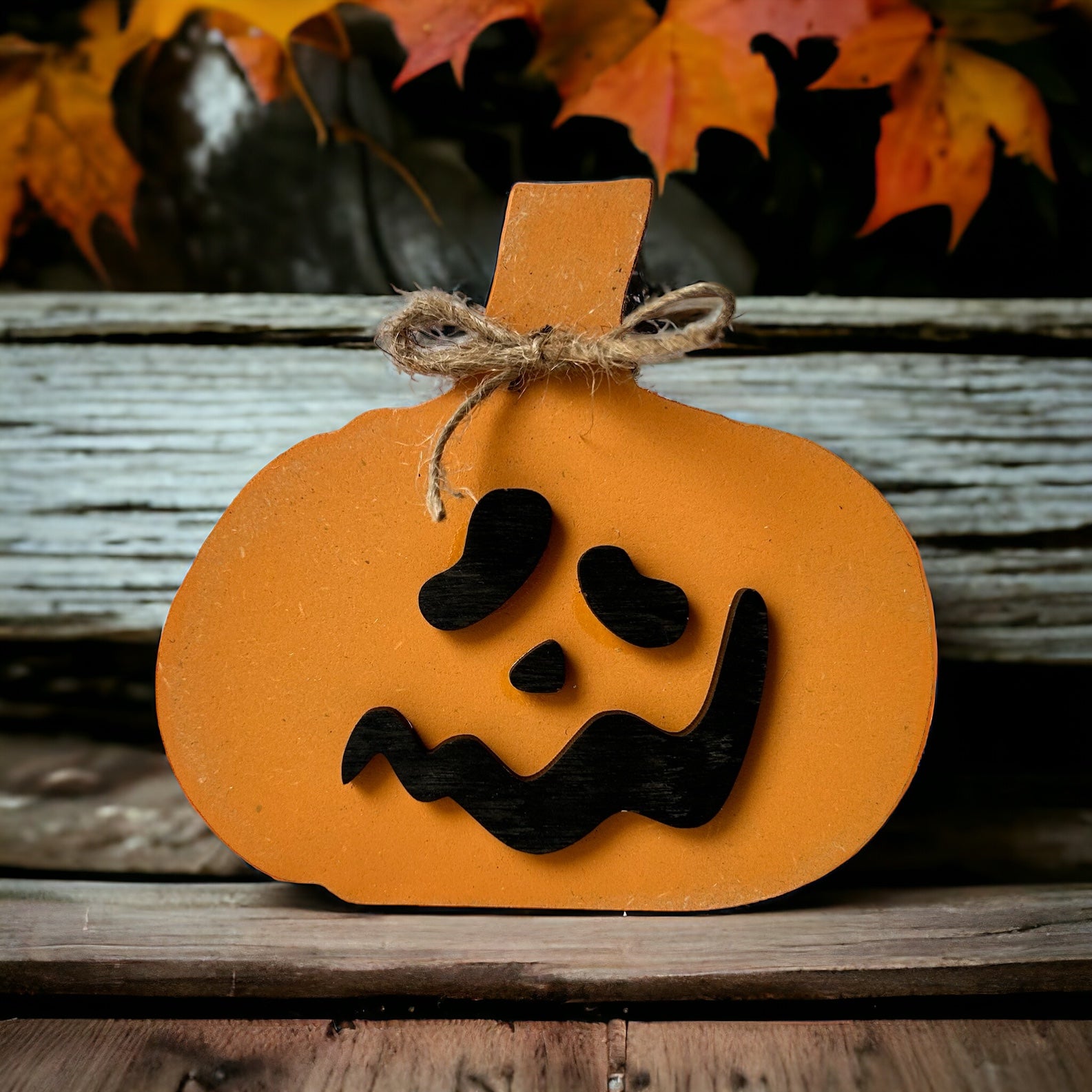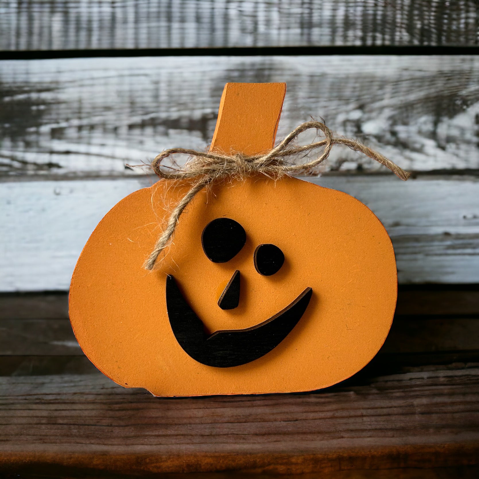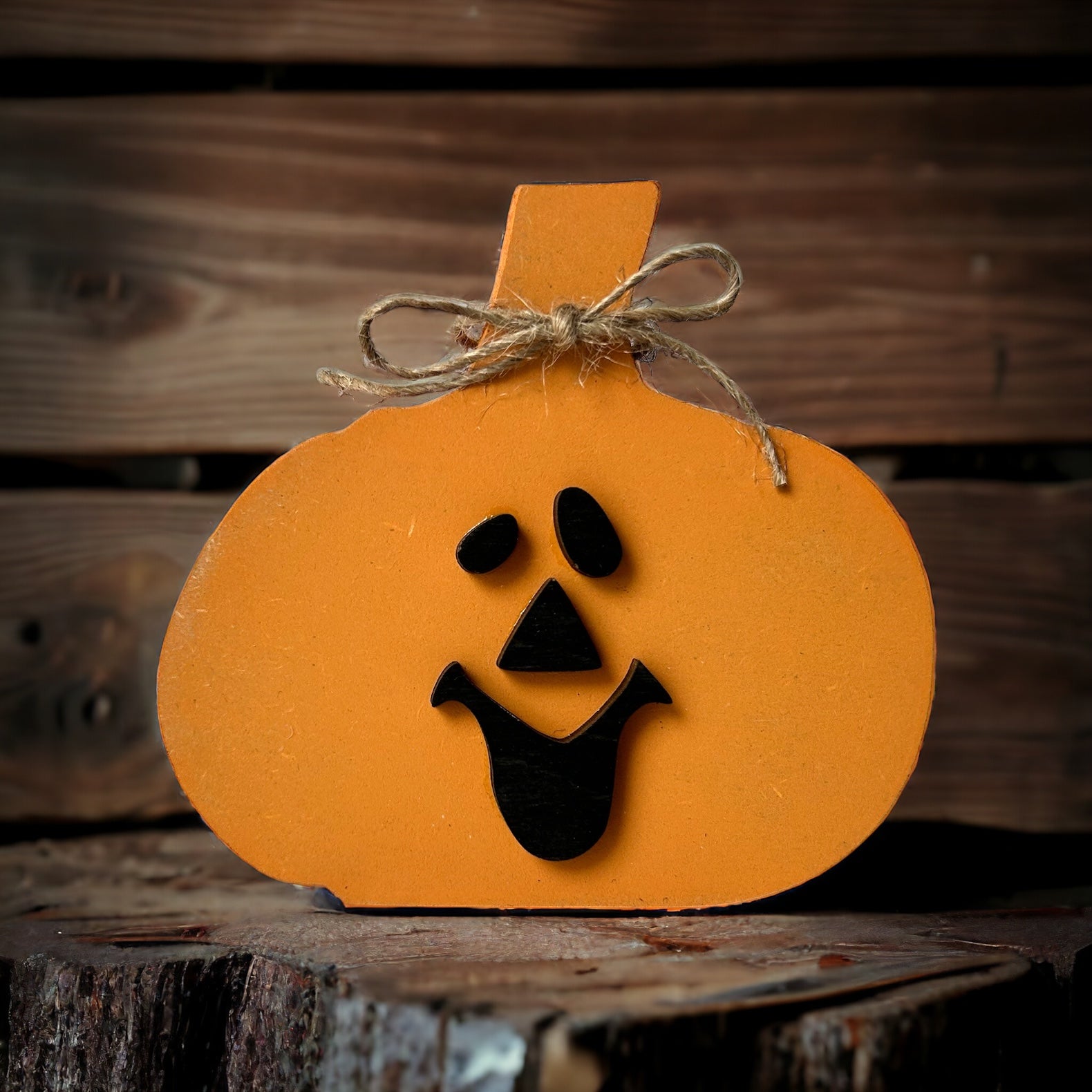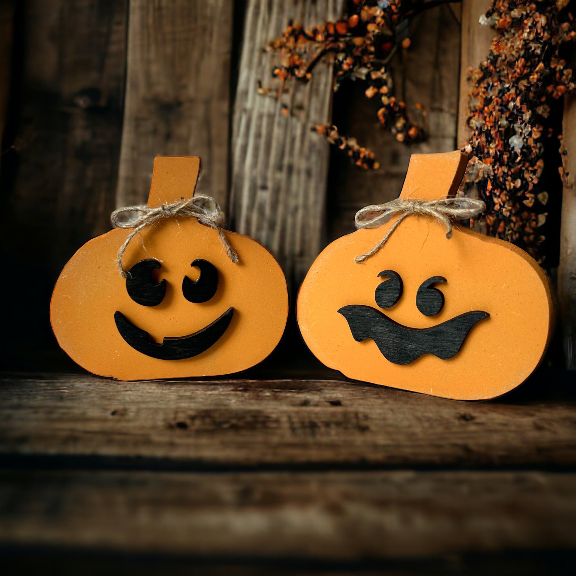 Handmade Halloween decorations. These 4.5” x 4.25” wood pumpkins are cut out of 3/4” MDF, painted in our prim orange color and feature 3D cut faces attached to the front. Twine bow around the top not permanently attached.