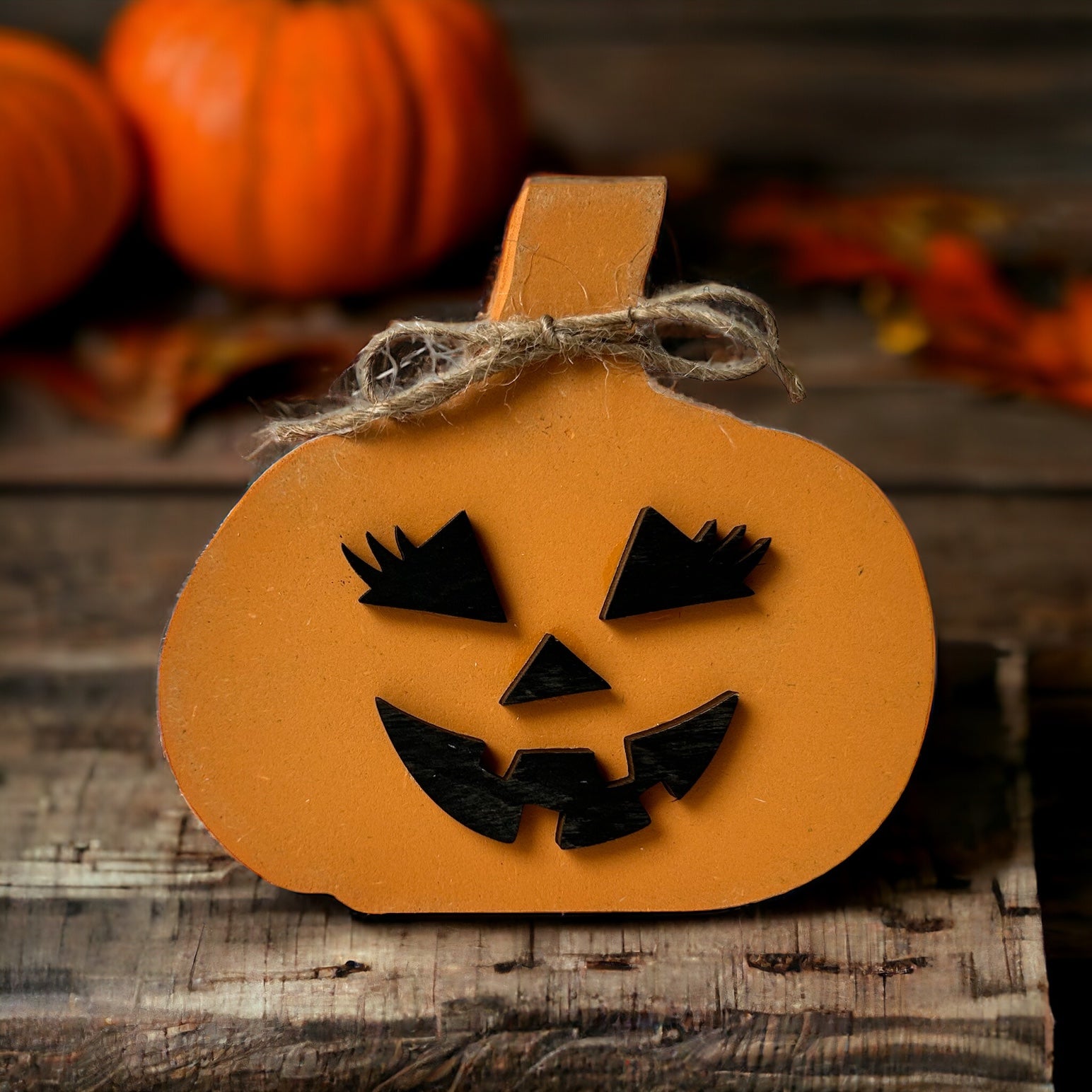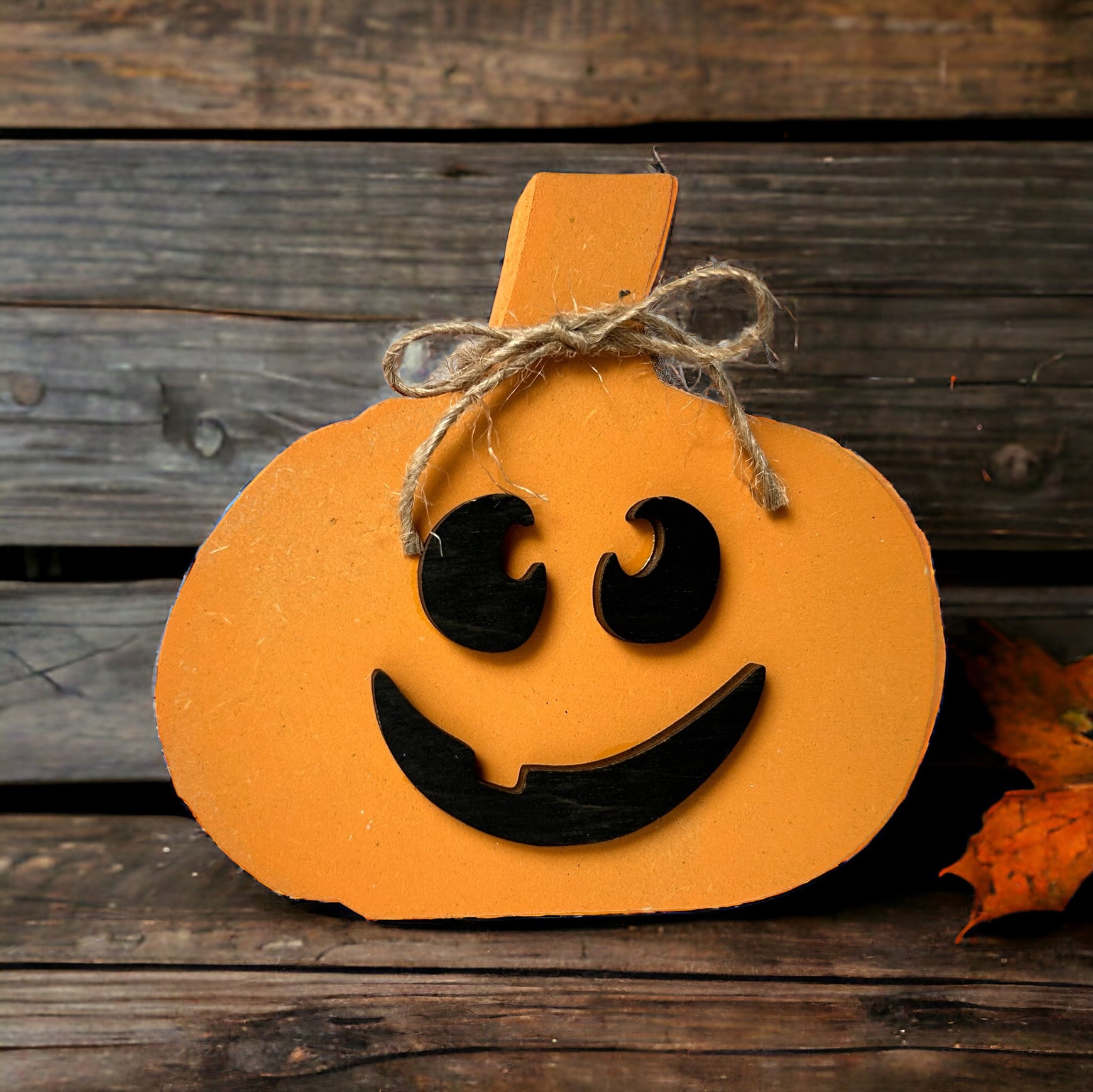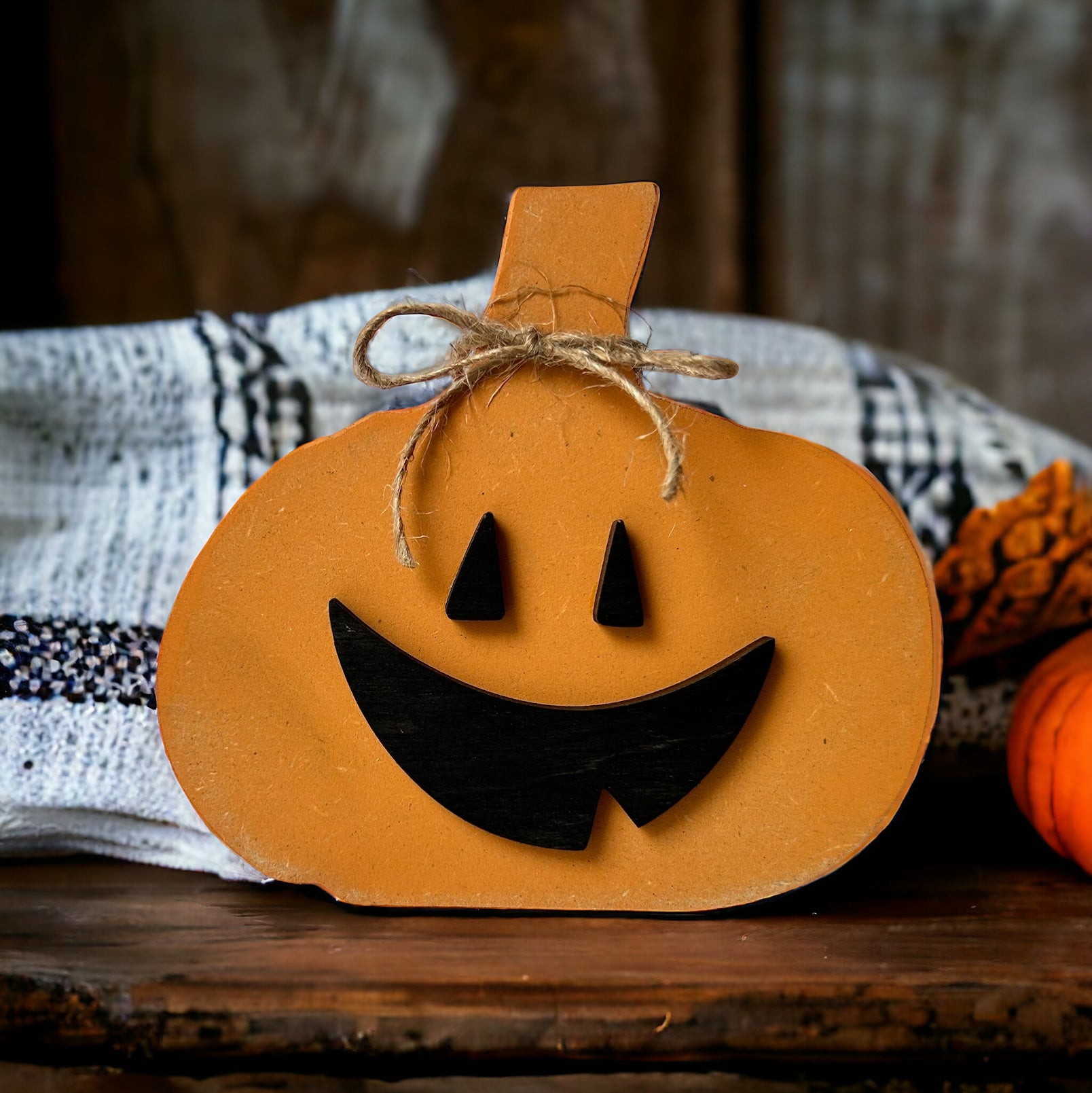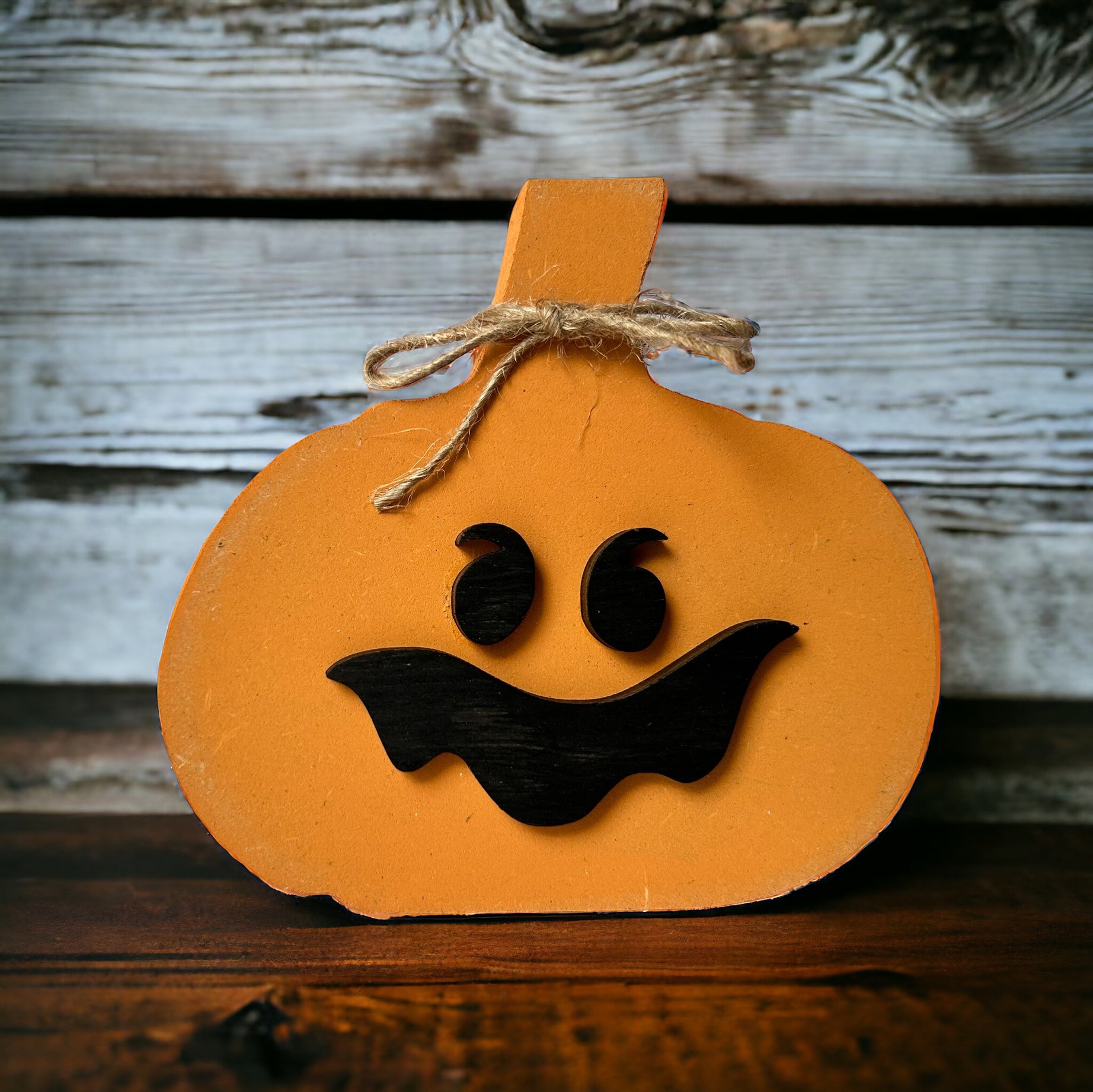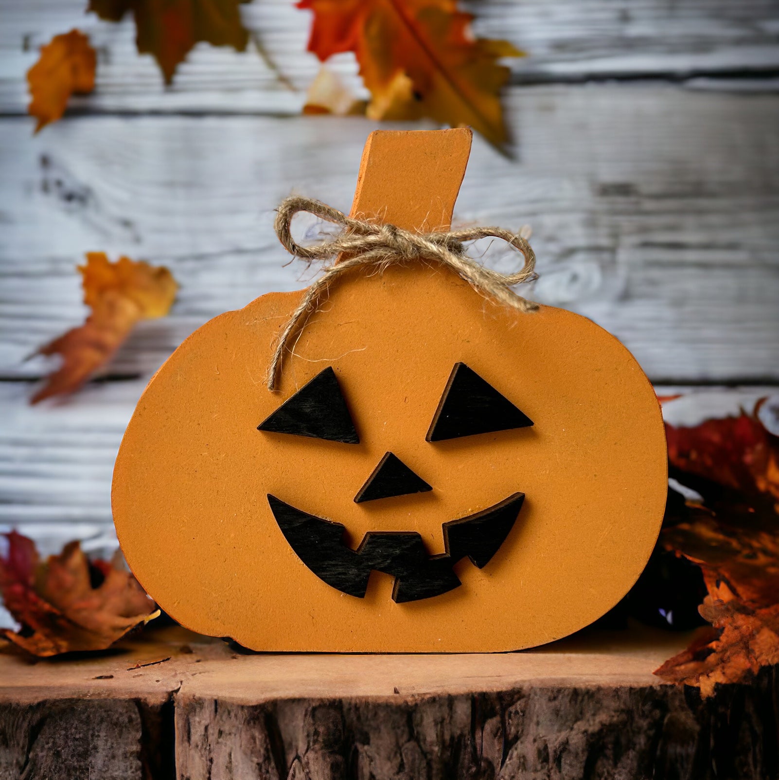 Handmade Halloween decorations. These 4.5” x 4.25” wood pumpkins are cut out of 3/4” MDF, painted in our prim orange color and feature 3D cut faces attached to the front. Twine bow around the top not permanently attached.