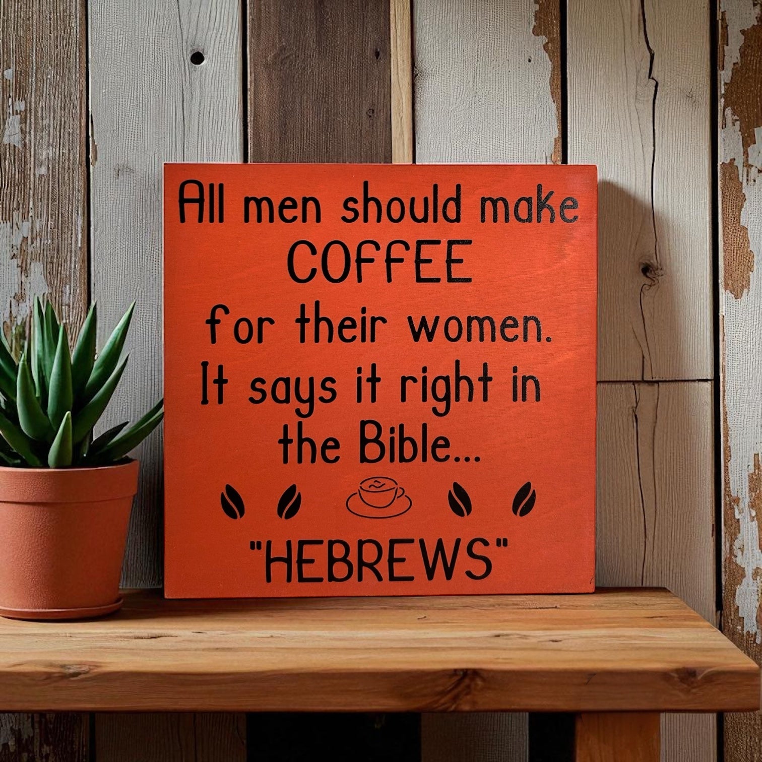 Enhance your home or kitchen with this unique, handmade 6"x6" wood sign that humorously states, "All Men Should Make Coffee for Their Wives. It says in the Bible Hebrews." Perfect for coffee lovers, Christian households, or anyone who appreciates a good chuckle with their morning brew!