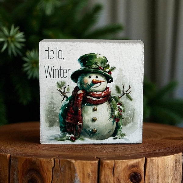 Hello Winter - Rustic Wood Block Sign Winter Snowman Decor