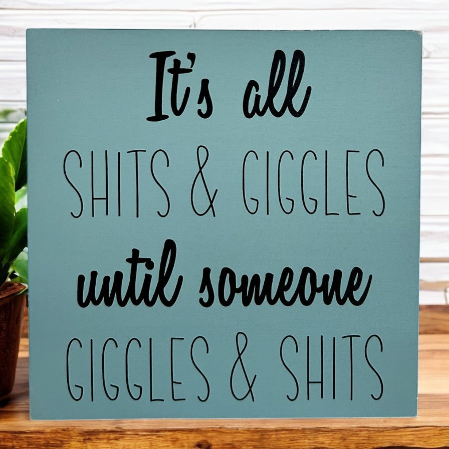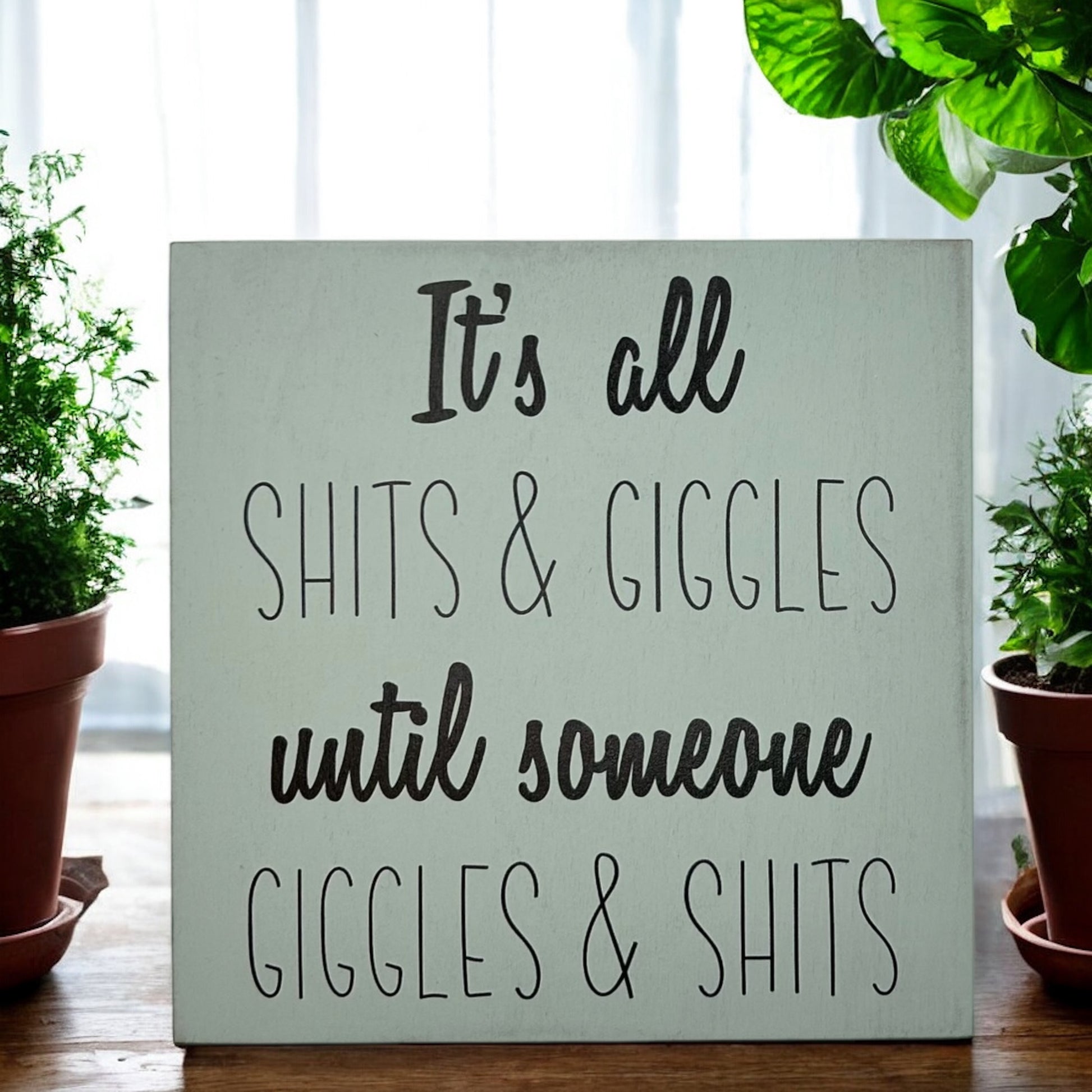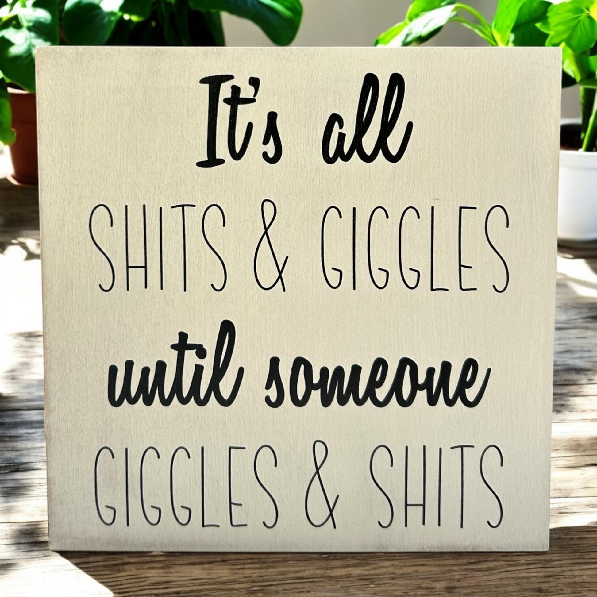 Add a dose of humor to your decor with our "It's All Shits & Giggles" Funny Wood Sign! Measuring 6 inches by 6 inches, this witty sign is crafted on high-quality 3/4” hard ply and features a hilarious message that's sure to elicit laughter. Perfect for propping up on a shelf, this sign adds personality and charm to any room. Whether as a playful gift or a fun addition to your own space, this sign is guaranteed to bring smiles.