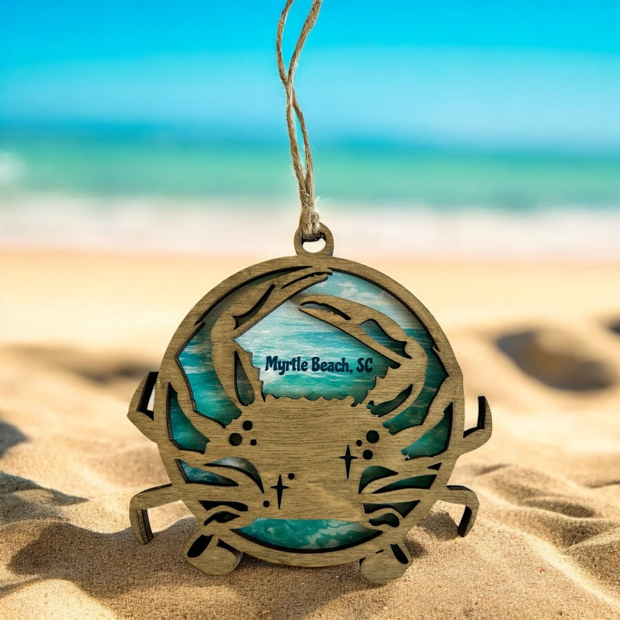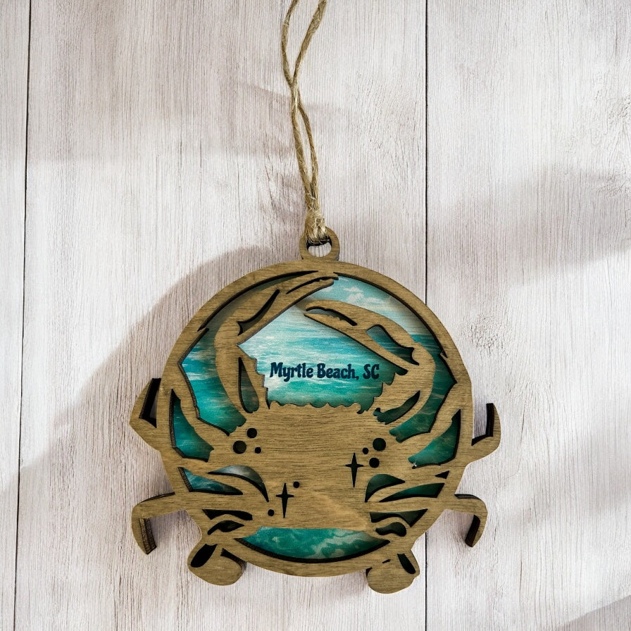 This ornament is created from two layers of wood with the bottom layer being a a printed ocean background with customizable wording. Comes packed ready for gift giving.