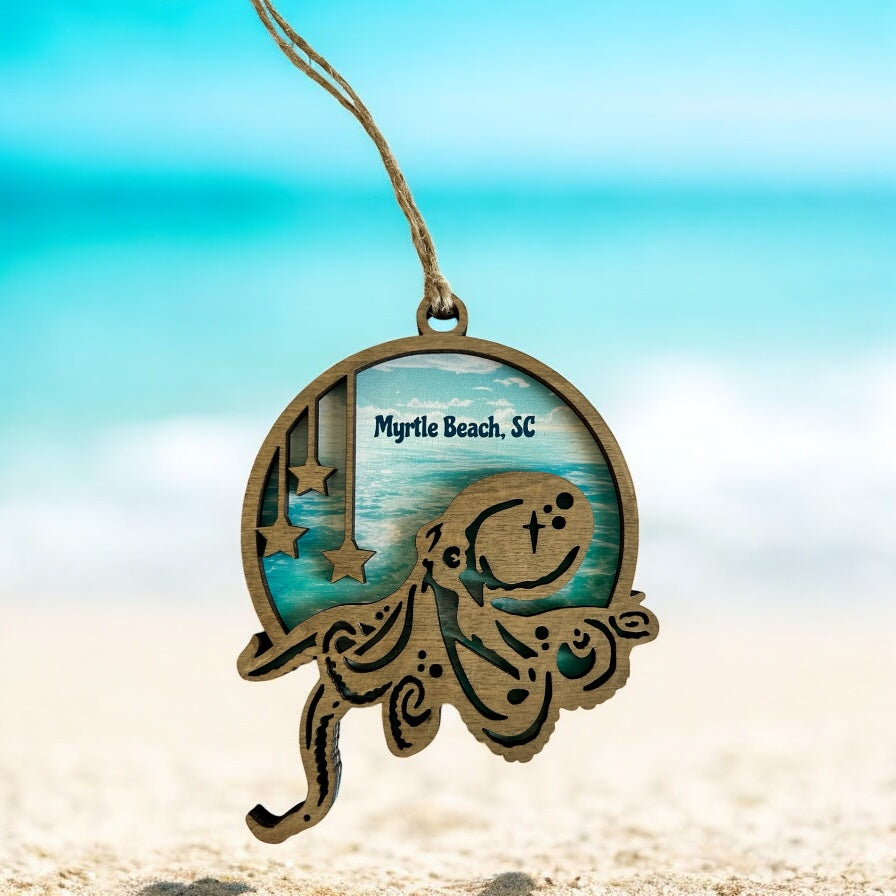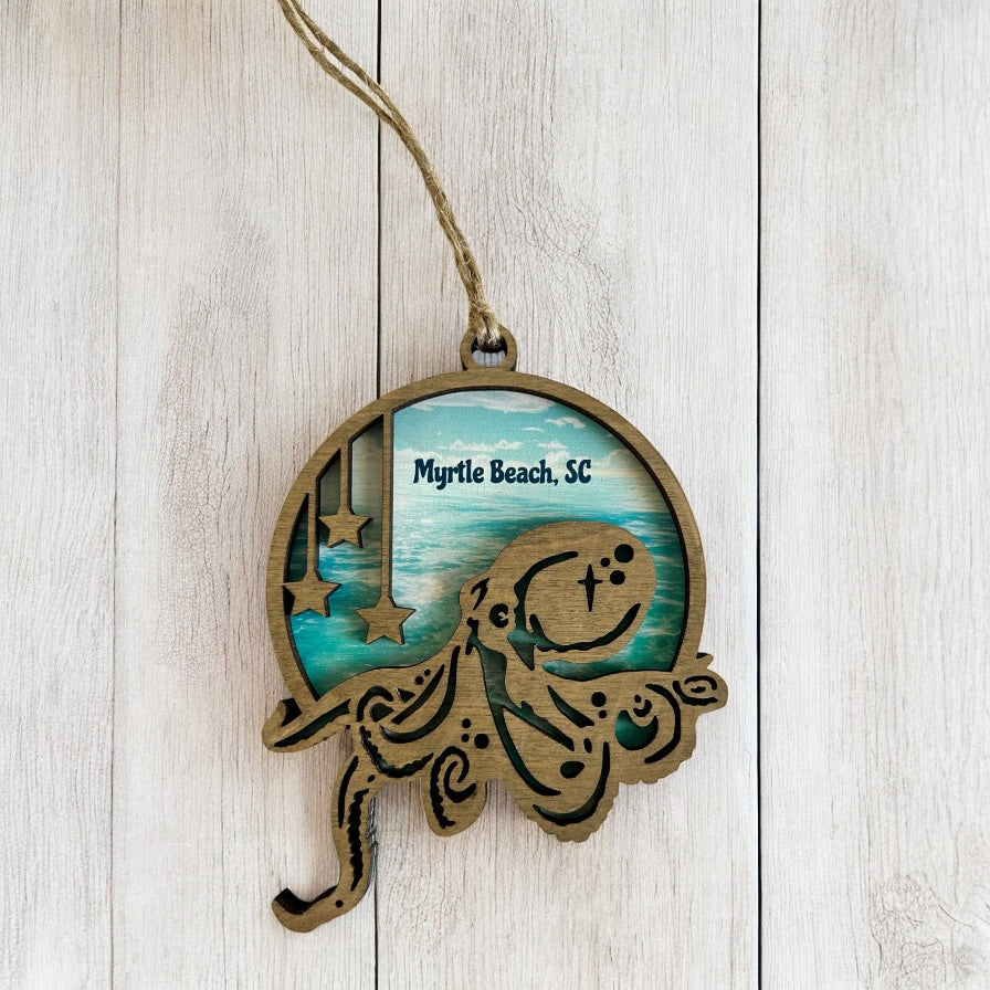 This ornament is created from two layers of wood with the bottom layer being a a printed ocean background with customizable wording. Comes packed ready for gift giving.