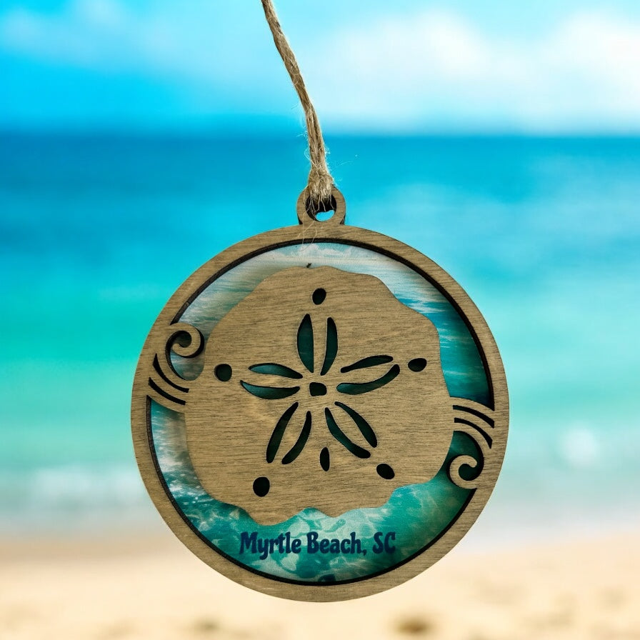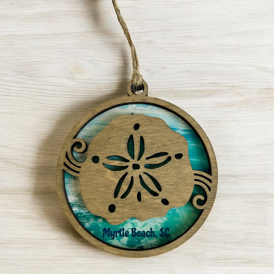 This ornament is created from two layers of wood with the bottom layer being a a printed ocean background with customizable wording. Comes packed ready for gift giving.