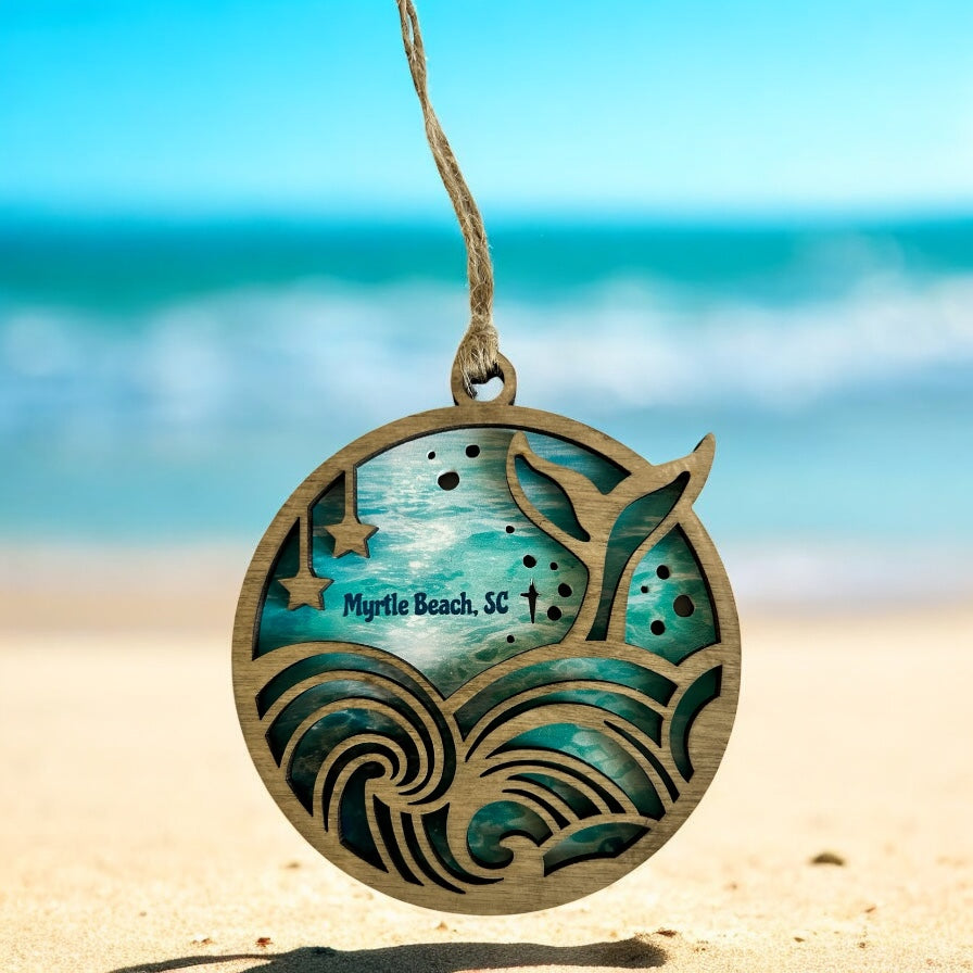 This ornament is created from two layers of wood with the bottom layer being a a printed ocean background with customizable wording. Comes packed ready for gift giving.