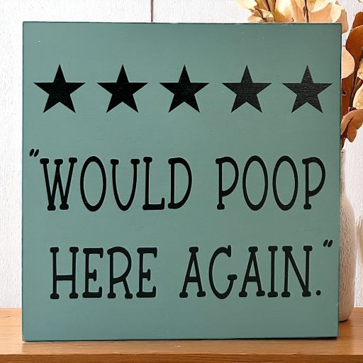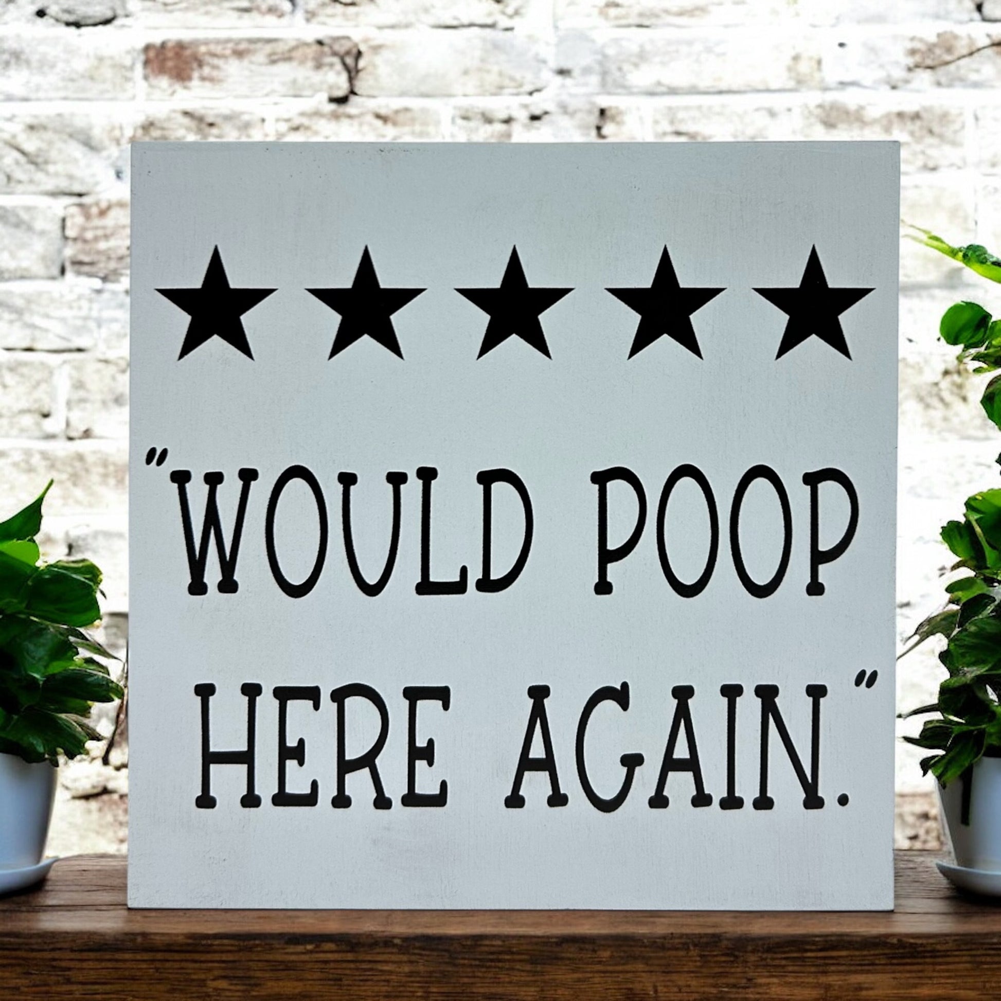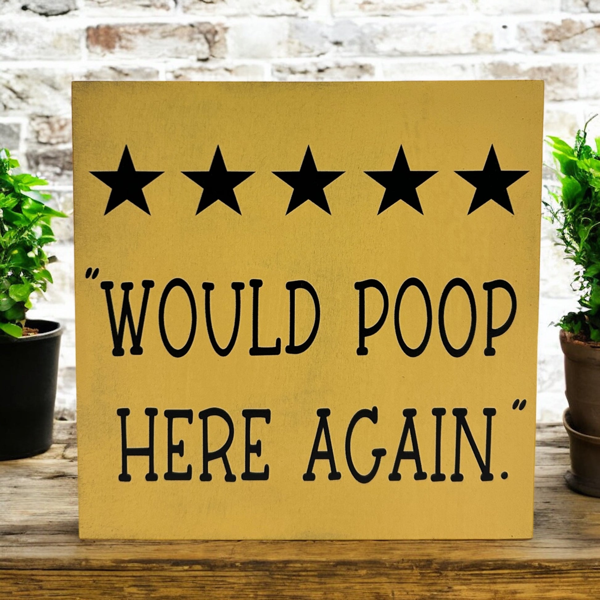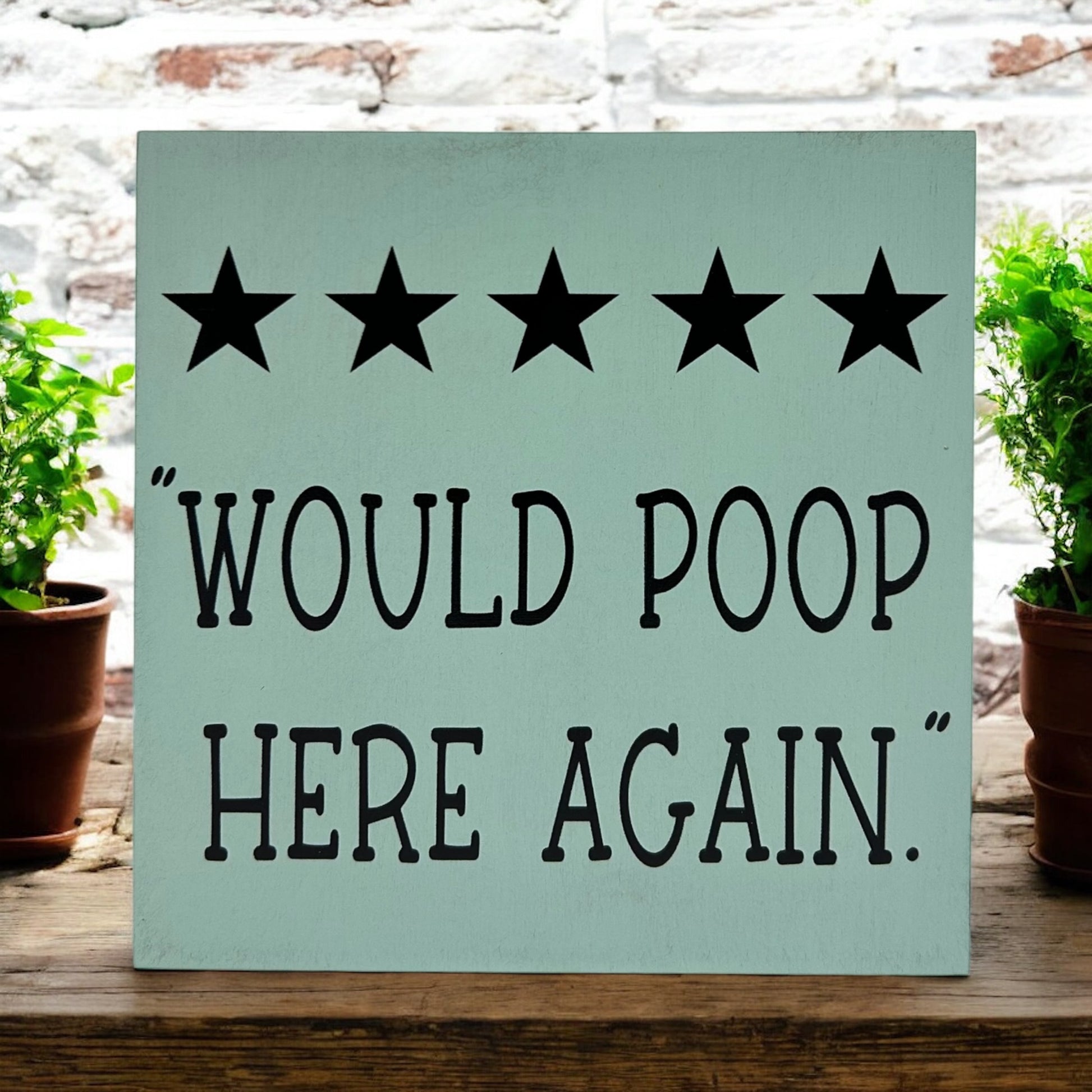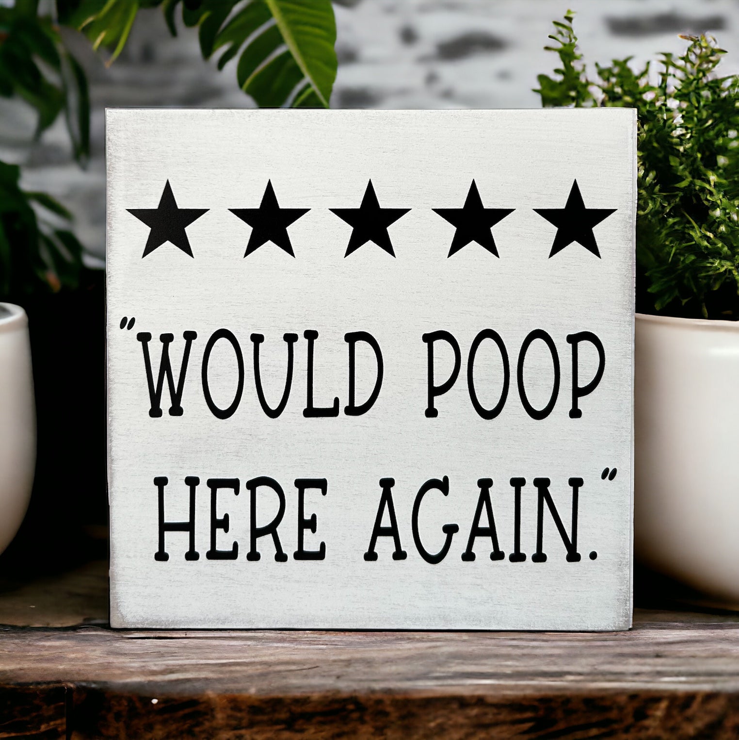 Let people know your bathroom is 5 star rated with our 6x6 inch rustic wood sign featuring the hilarious saying 'Would Poop Here Again'.