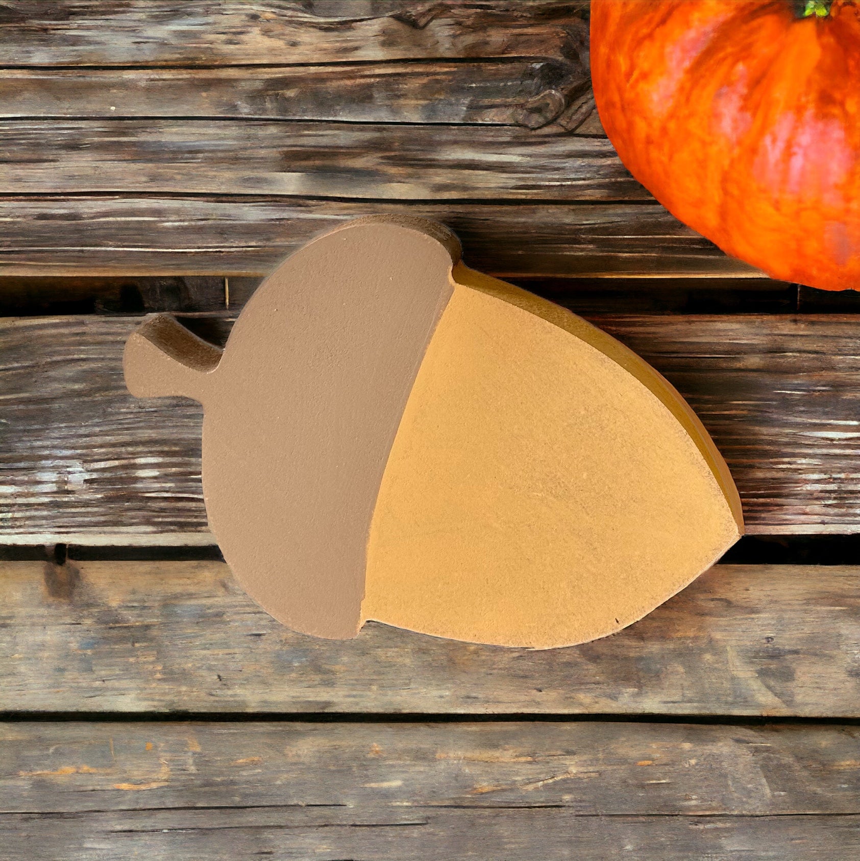 These wood acorns are the perfect addition to your home's Fall décor. Made out of 3/4" MDF, painted gold and brown and lightly sanded for a primitive look . *No two acorns will be exactly the same