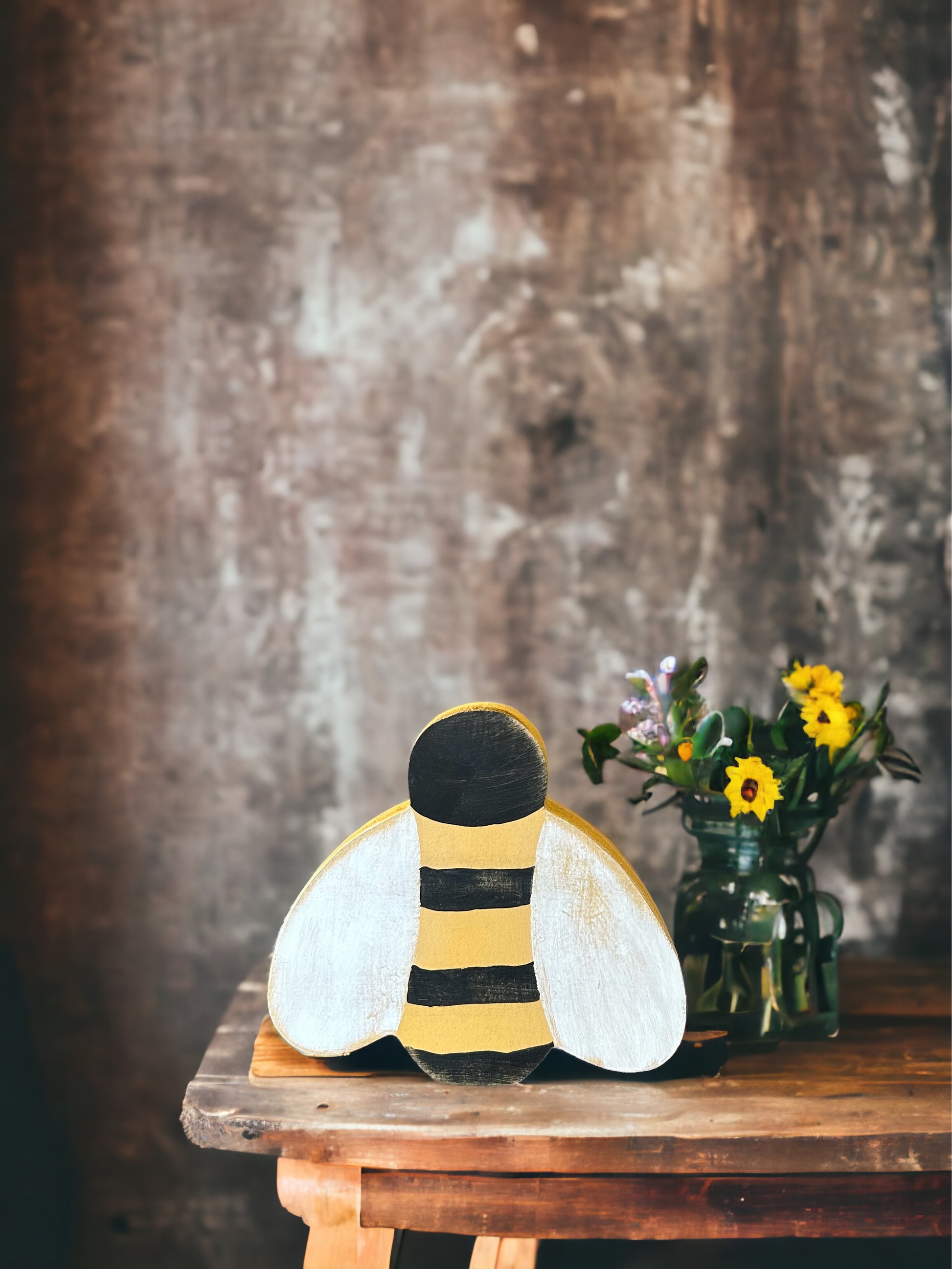 These wood bees are the perfect addition to your home's Spring & Summer décor. Made out of 3/4" MDF, painted all over gold then hand painted wings/stripes. I lightly sand all over for a primitive/rustic look . *No two bees will be exactly the same