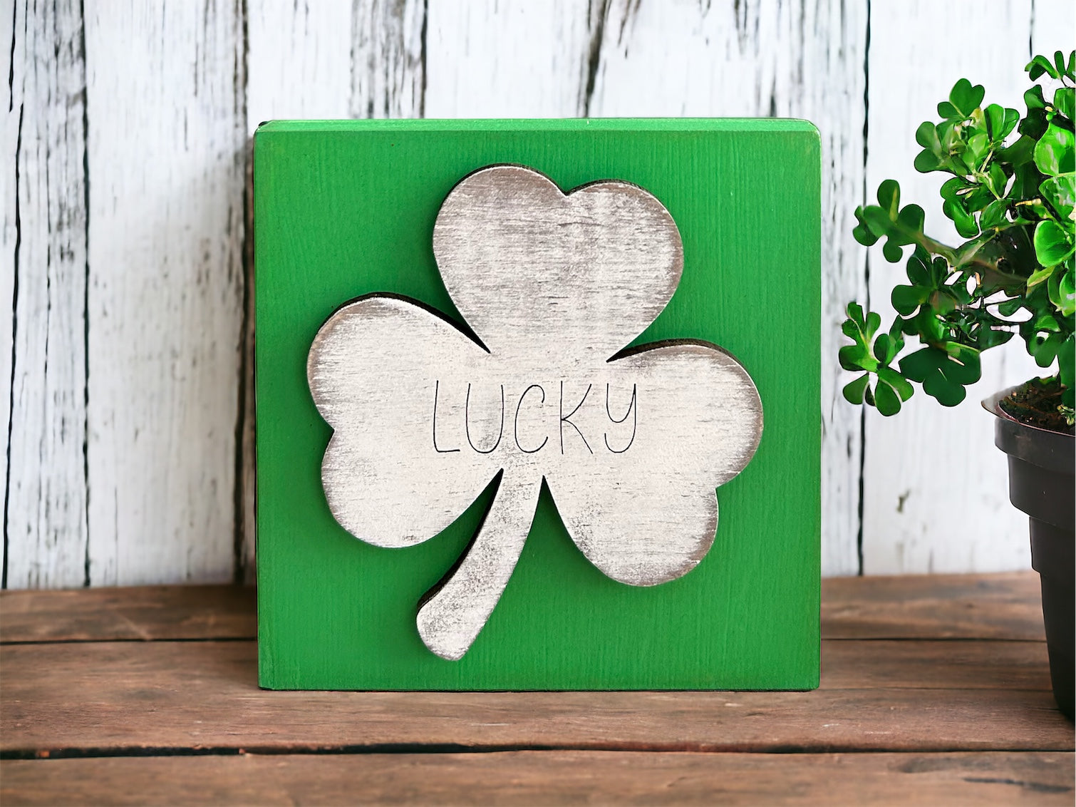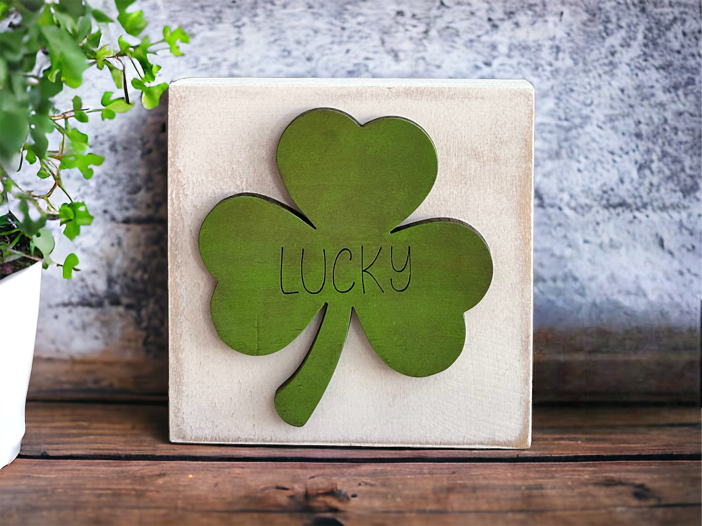 Rustic/Farmhouse Engraved “Lucky” Clover Wood Block Sign