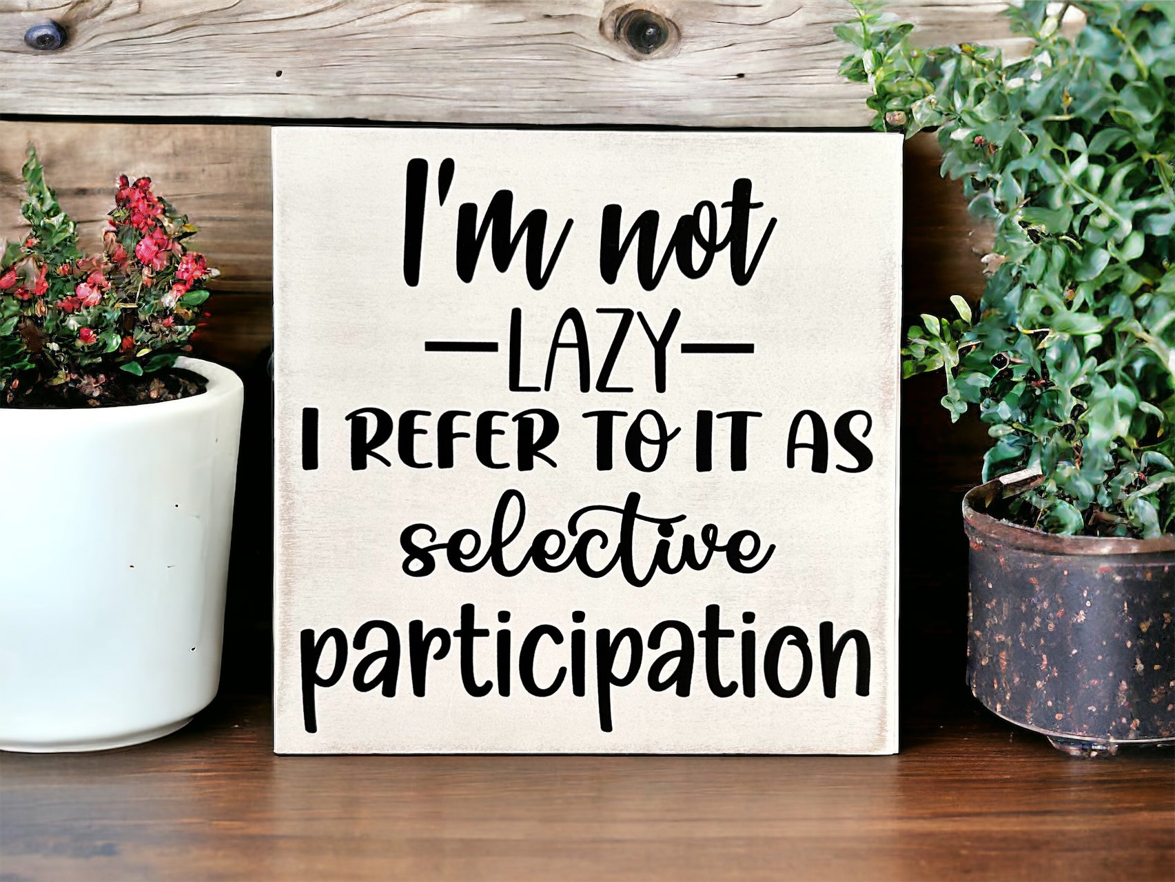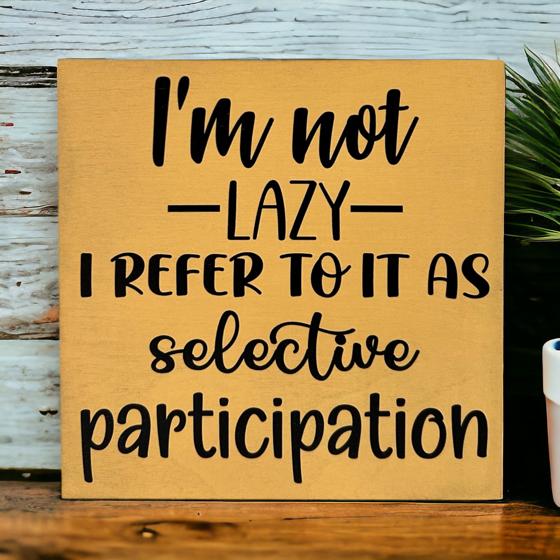 Embrace your unique approach to productivity with our "Selective Participation" Funny Wood Sign! Crafted on 3/4" hardwood ply, this witty sign measures 6 inches by 6 inches and adds a touch of humor to any space. Whether you place it on your table or display it on a shelf, this sign is sure to spark laughter and conversation. It's the perfect gift for the selectively participatory person in your life or a fun addition to your own decor.