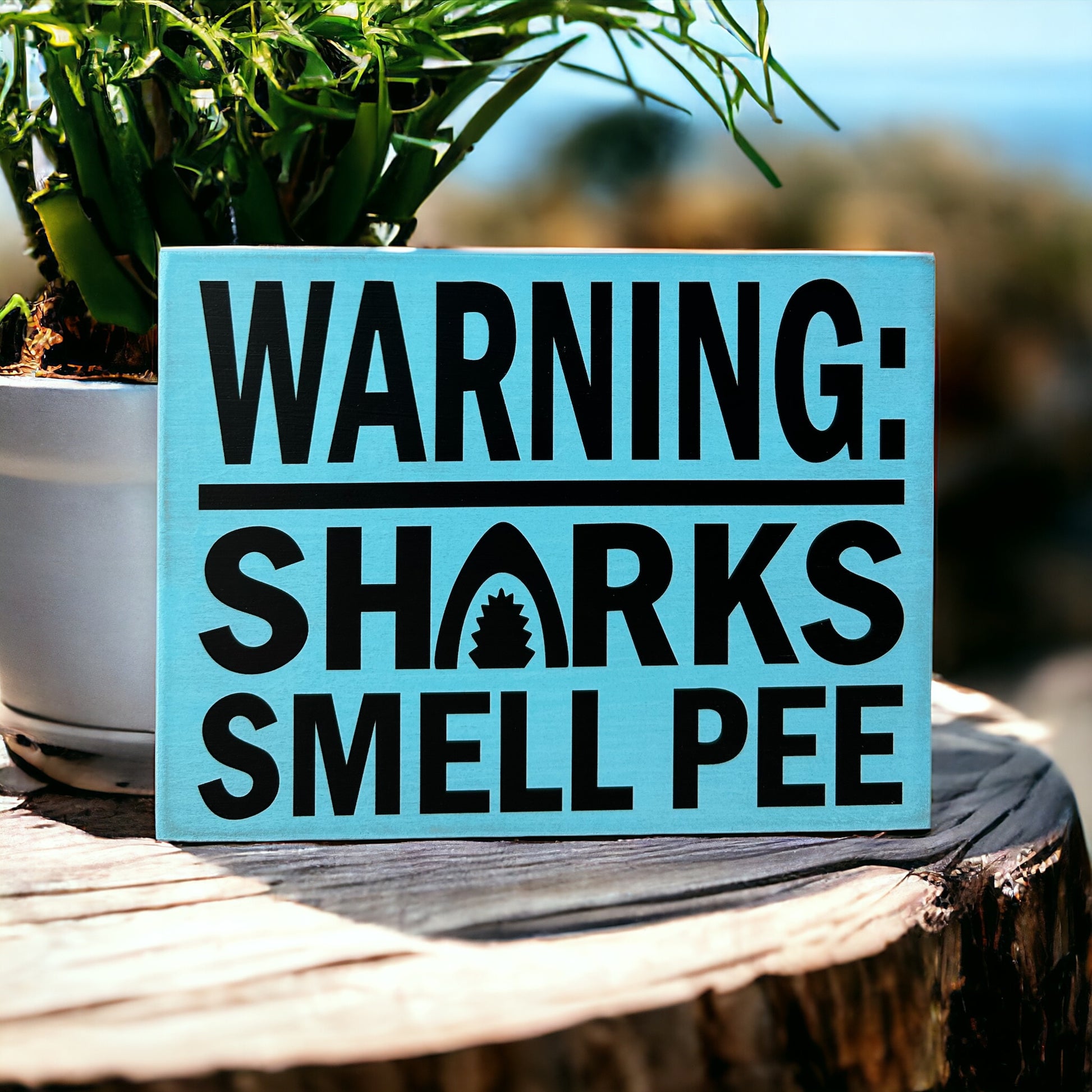 Sharks Smell Pee - Funny White Rustic Wood Beach Sign