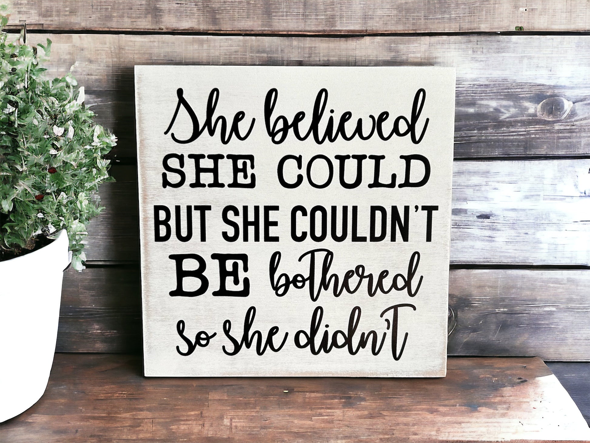 Inject a dose of humor into your space with our "She Believed She Could But She Couldn't Be Bothered So She Didn’t" Funny Wood Sign! Crafted on durable 3/4" hardwood ply, this witty sign measures 6 inches by 6 inches and is sure to elicit a chuckle. Whether displayed on a table or placed on a shelf, it adds personality and charm to any room. It's the perfect gift for the laid-back or a humorous addition to your own decor collection.
