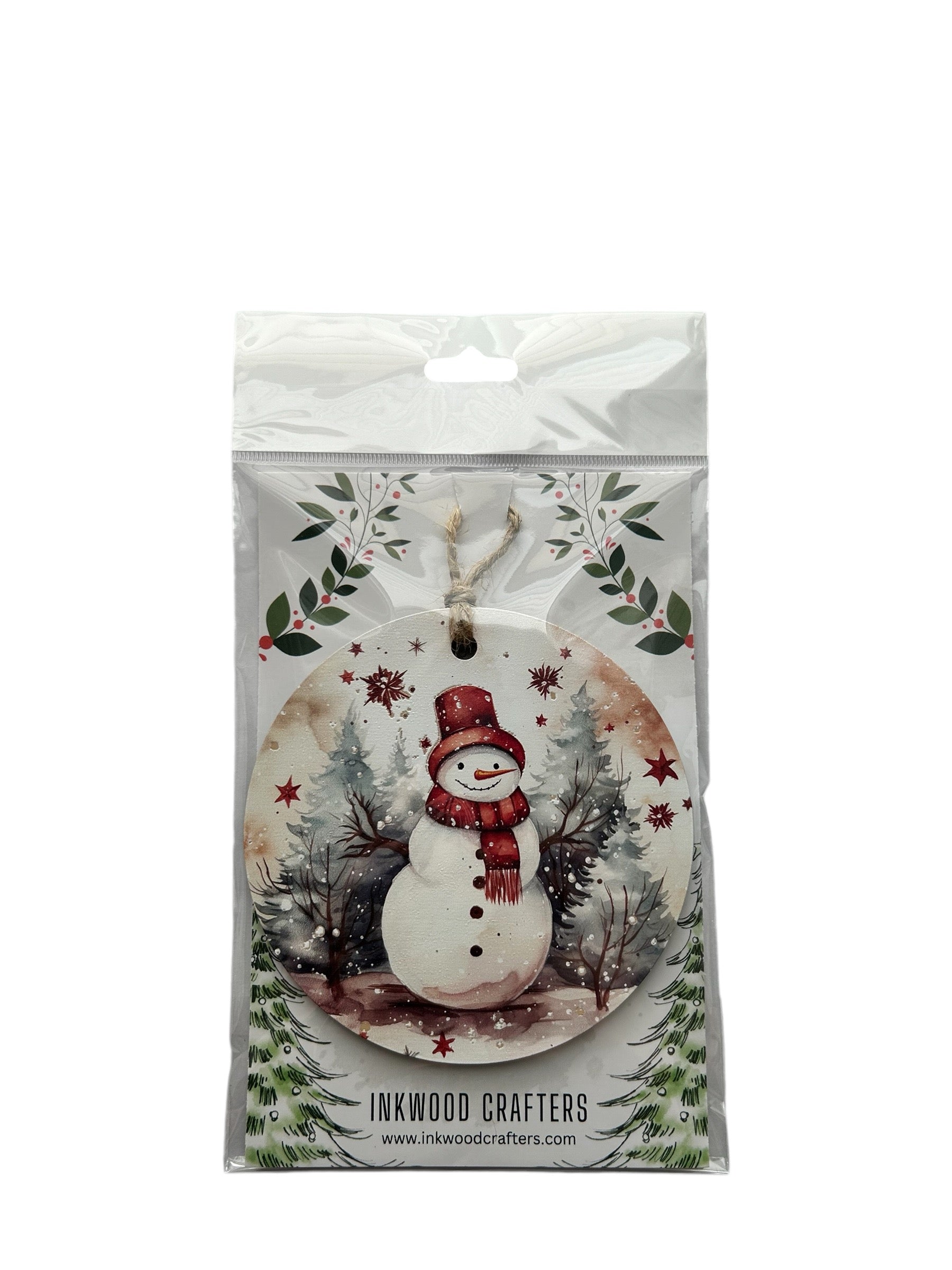 This is a high quality printed Snowman ornament created on 1/4” wood. It measures 4.5” round and packaged ready for gift giving. Simple twine string to keep the rustic charm.