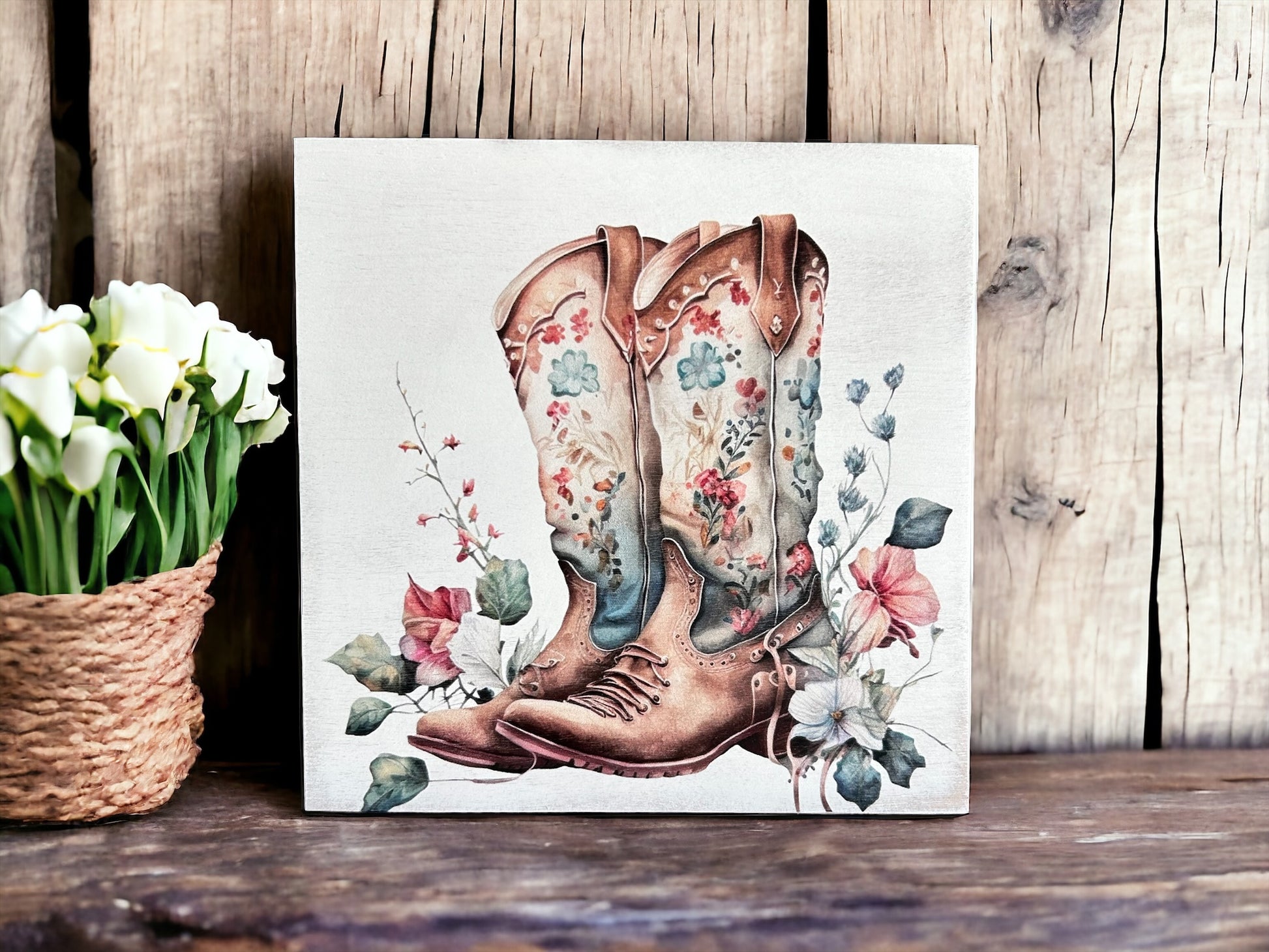 Celebrate the arrival of spring with our charming Spring Cowgirl Boots Wood Sign! Measuring 6 inches by 6 inches, this delightful sign features a vibrant image of cowgirl boots adorned with spring flowers, adding a touch of rustic charm to your decor. Crafted on high quality hardwood ply, this sign is perfect for displaying on a shelf, or adding to a seasonal vignette. It's the ideal way to welcome the beauty of spring and country into your home.