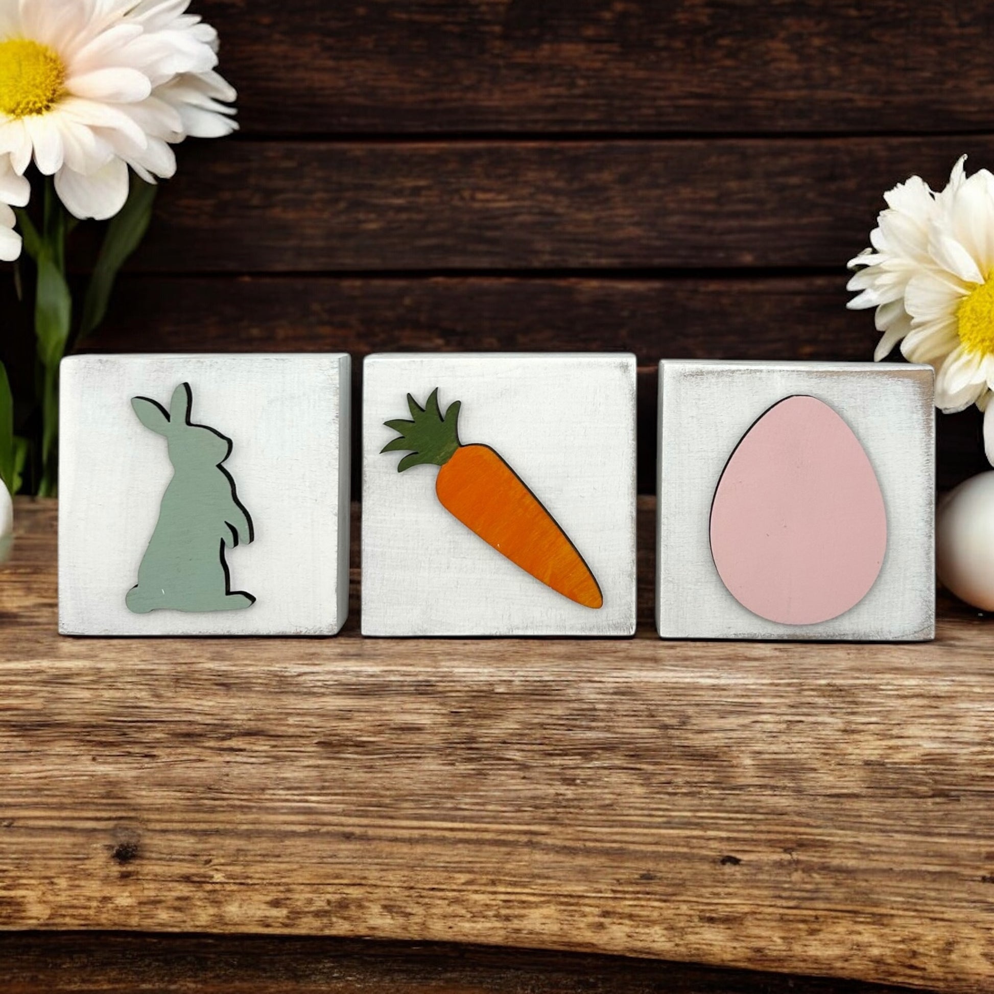 Sweet set for Spring/Easter decor. These 3”x3” wood signs feature a carrot, Easter egg, and bunny cut and painted from 1/4” wood and attached to the front.