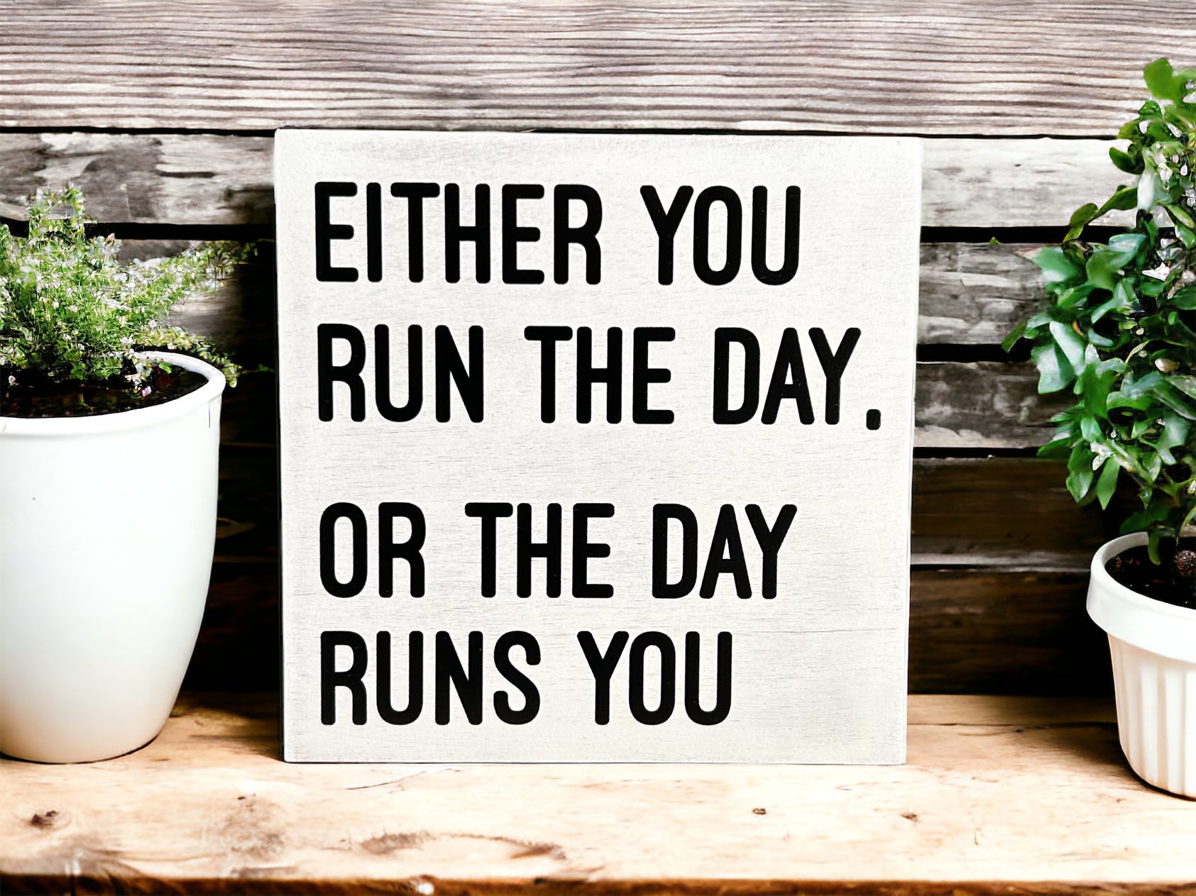 Either You Run the Day or the Day Runs You- Rustic Wood Sign