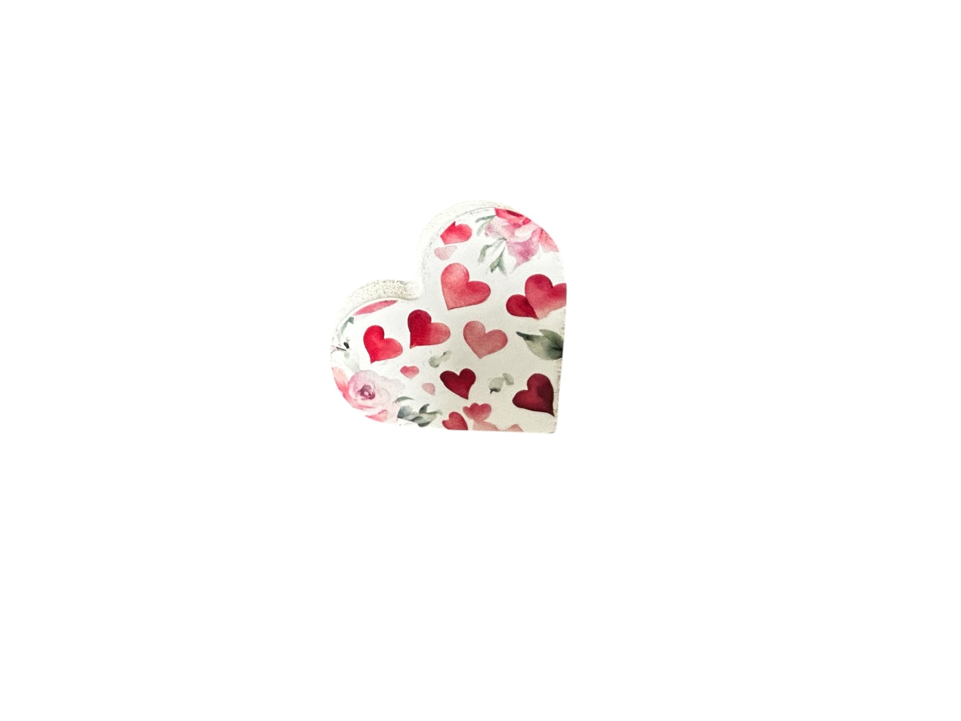 Wood hearts created from 3/4” MDF, painted in either white or red on all sides. A high quality UV ink cured image is applied to the front side.