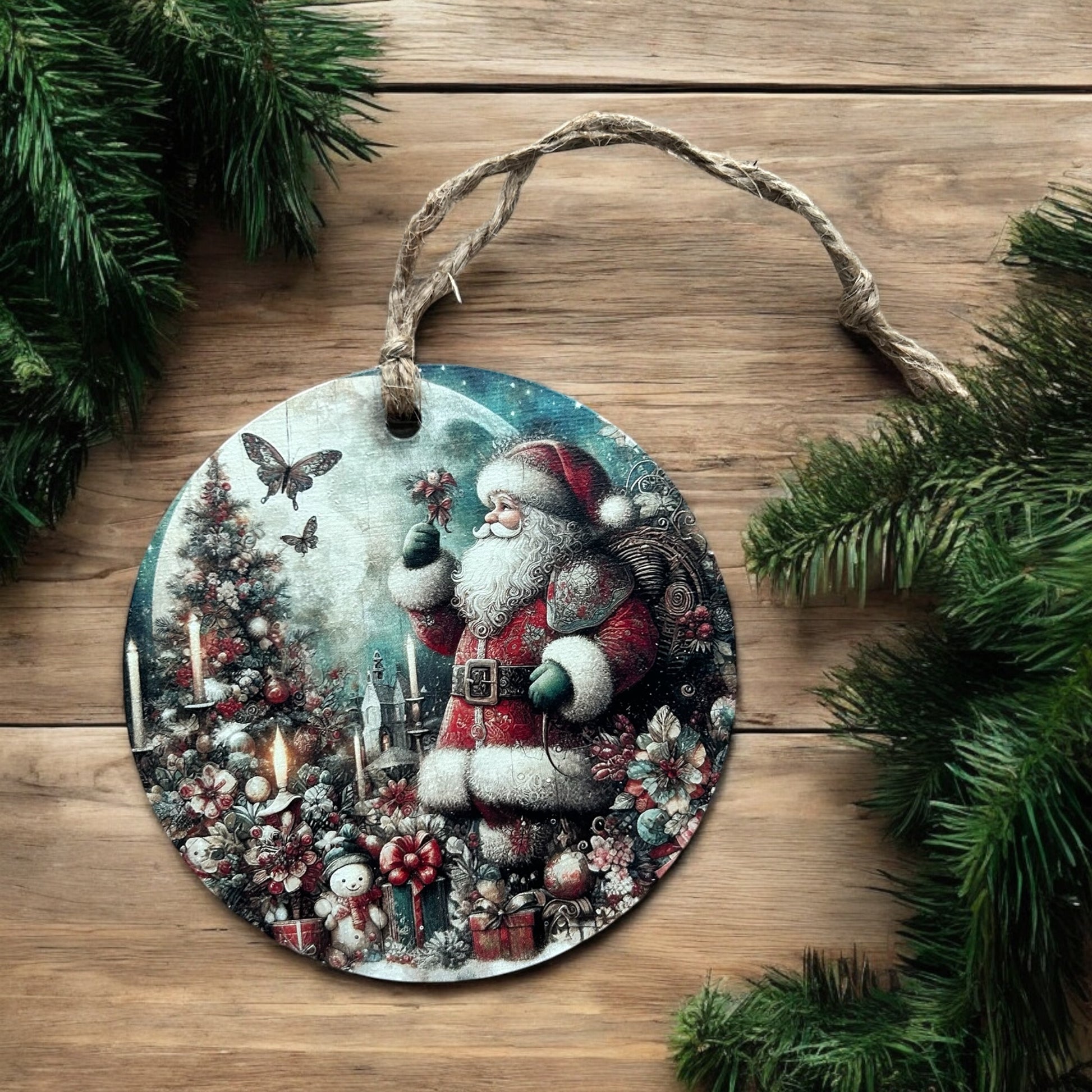 Vintage Santa with Butterfly - Wood Christmas Ornament