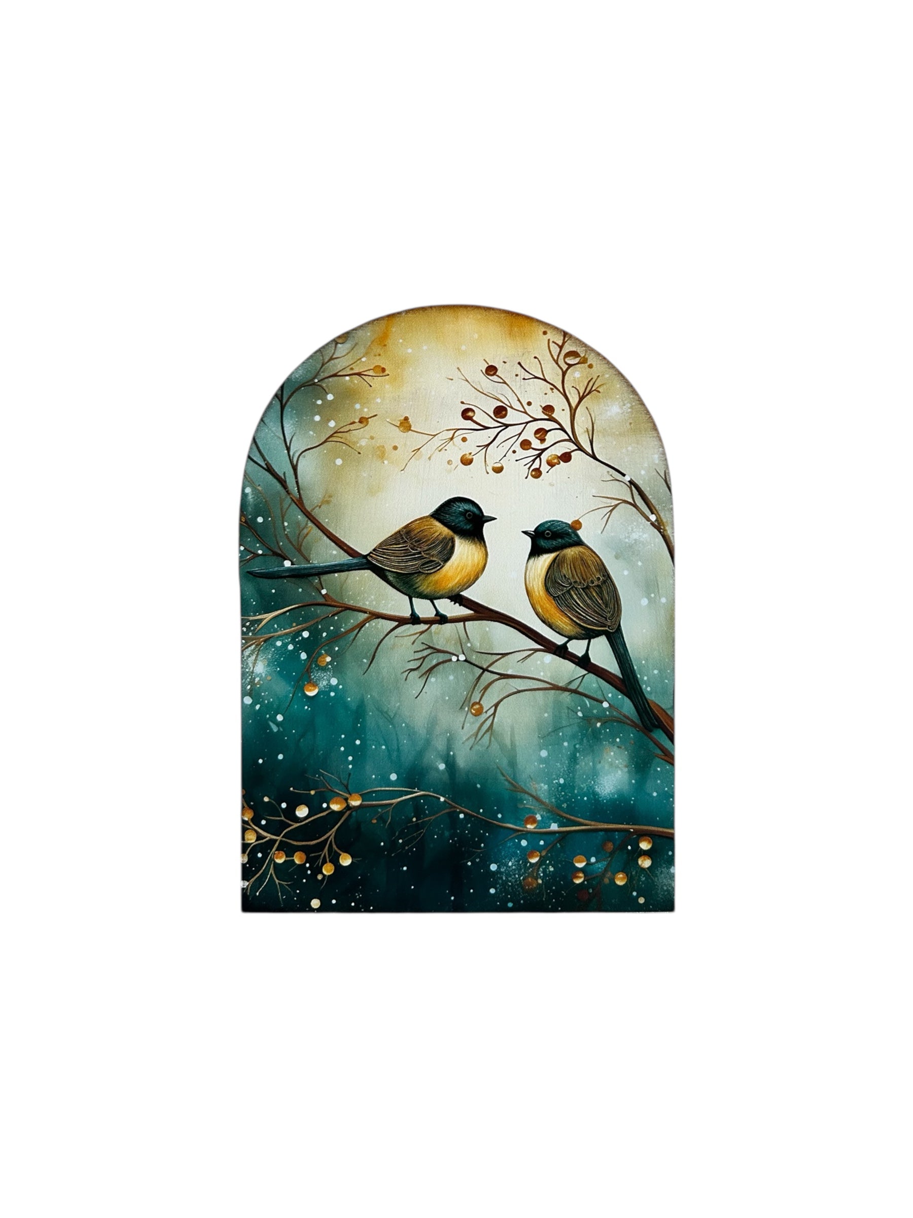 Sweet Holiday winter birds design printed on a 3/4”MDF free standing wood arch. Painted white on front and sides, sanded and a high quality image printed on the front with UV cured ink.
