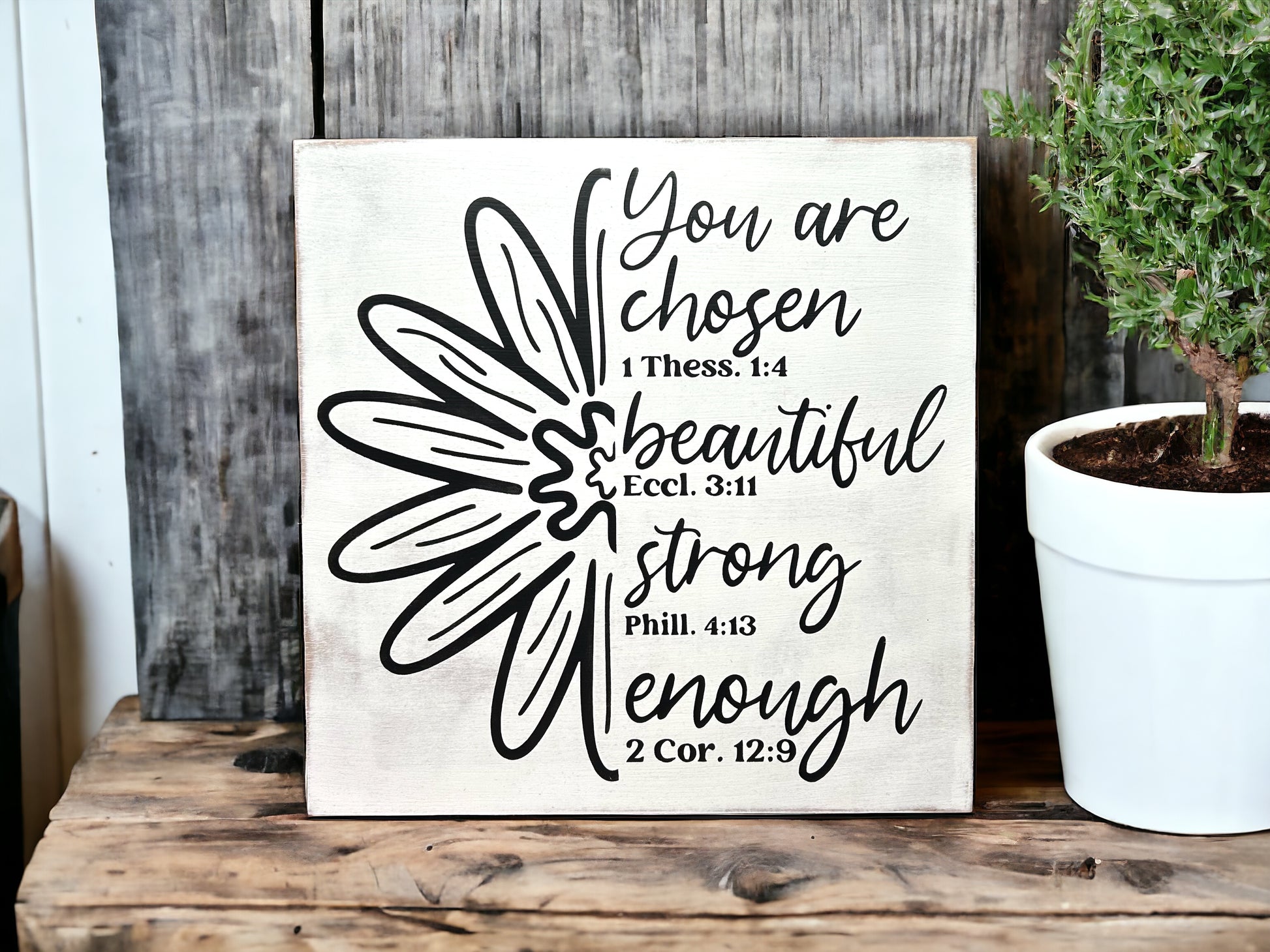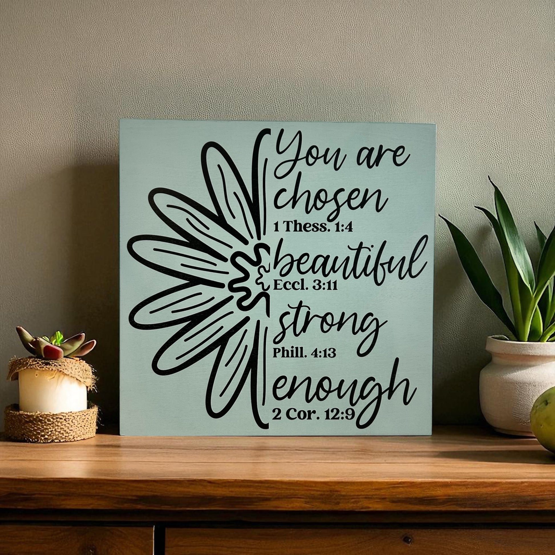 Inspire yourself and others with our "You Are Chosen, Beautiful, Strong, Enough" Faith-Based Wood Sign. Crafted on high quality 3/4" hardwood ply, this uplifting sign measures 12 inches by 12 inches, making it a striking focal point for any room. With its heartfelt message, this sign serves as a reminder of faith, strength, and beauty. Whether displayed on a wall or propped up on a shelf, it adds warmth and encouragement to your home decor.